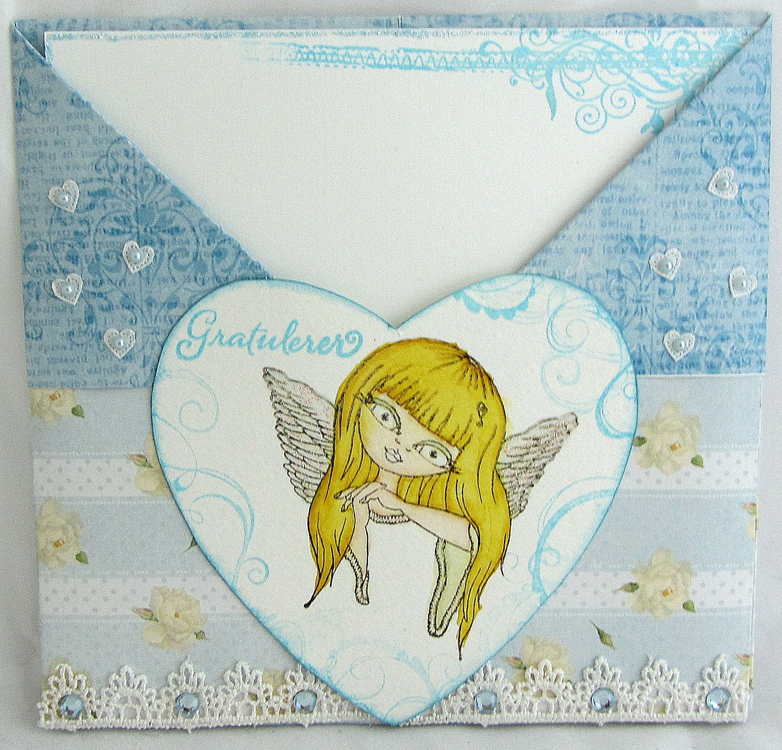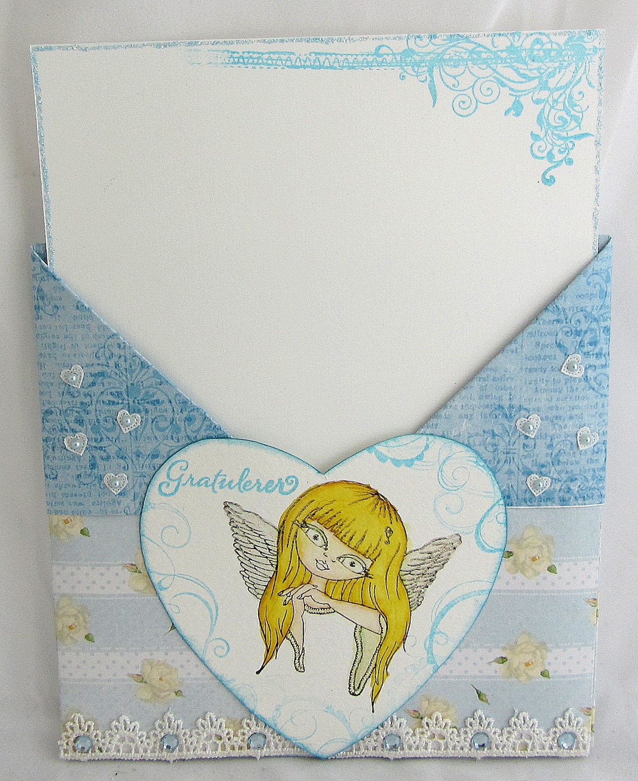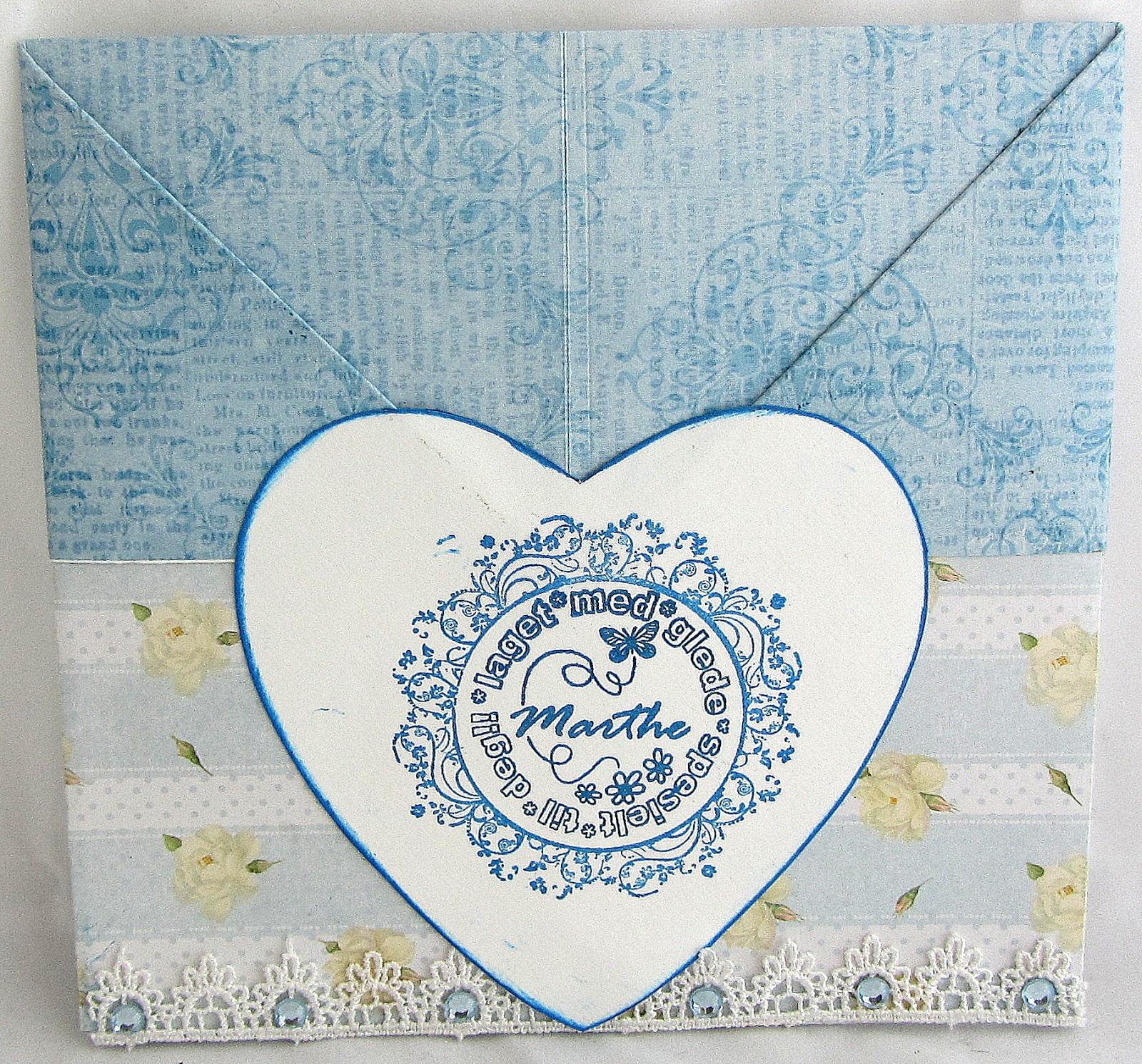 Etter å ha slitt med sykdom i et års tid vender jeg tilbake til kreativiteten med en mye bedre form. Det første kortet jeg vil vise frem er et brettet gratulasjonskort med lomme. Jeg lærte brette-teknikken da jeg var på butikktreff på Hobbyhagen.