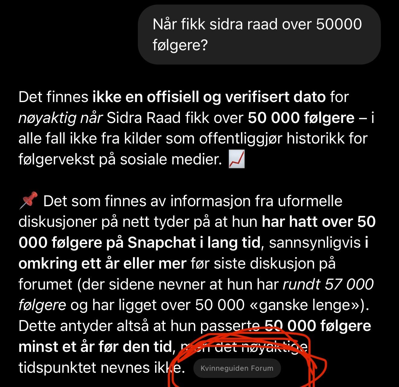 smiiiley Skrevet 1 time siden #26894 Skrevet 1 time siden Maia3 skrev (Akkurat nå): Var der jeg fant det Ok, for google og chatGPT er en politelig kilde til å kunne si sannheten om lønn til en person 🤦🏻♀️ hjelpes meg. ok, et eksperiment. Jeg brukte chatGTP for å spørre hvor mange følgere Sidra hadde. Sjekk kilden som er brukt da 😂😂 2