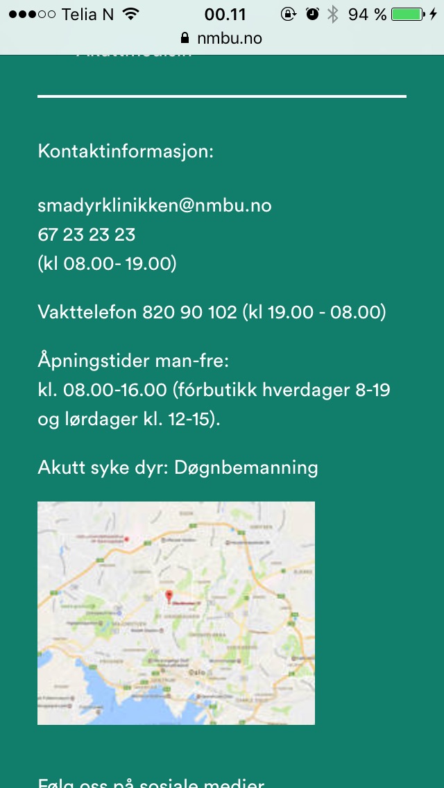 Miss.Wildfox Skrevet 20. juni 2017 #5 Skrevet 20. juni 2017 Dyrlegevakt døgnet rundt Vi tilbyr dyrlegevakt 24 timer i døgnet. Vi er her for deg når du trenger akutt hjelp, noe som gir en ekstra trygghet i hverdagen. Vi har fått nytt nummer på vår vakttelefon: 820 92 222. Vakttelefonen brukes utenfor våre åpningstider for akutte henvendelser ang hund og katt. Utenfor åpningstidene våre koster det 1900,- ekstra for at veterinæren skal rykke ut til klinikken - i tillegg til vanlige priser. 3