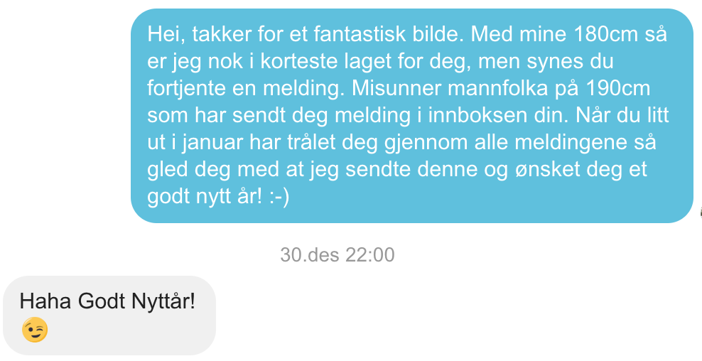 Kreator Skrevet 8. mars 2018 #10 Skrevet 8. mars 2018 (endret) Ha ha, har en relevant "war story" å dele fra i dag faktisk! Så en flott jente med et fantastisk bilde på tampen av fjoråret, og benyttet anledningen til å sende en hyggelig kommentar. Fordi de fleste jenter foretrekker menn som er litt høyere og jeg forsåvidt damer som er lavere enn meg selv og hun her kun var noen få cm lavere enn meg så gjorde jeg det klart allerede i min hyggelige melding at dette nok var utfordrende. Her er det jeg sendte og svaret jeg fikk samme dag: Det tragikomiske er jo at hun i dag klikket på min profil (bytter jo bilder innimellom så mulig hun ikke kjente meg igjen), og hun reagerte da med å insta-blokkere meg. Må jo lure på hva hun er redd for. Utover den hyggelige meldingen jeg sendte så har jeg ikke sendt noen flere meldinger eller på annen måte indikert videre interesse (rakk ikke trykke på hennes profil, men husket jo nicket hennes). Kvinner liker jo å framheve seg selv som bedre på kommunikasjon og høflighet enn menn, men sjekkeapper er kanskje unntaket (yeah yeah, "det er så travelt, har ikke tid til å være høflig.."). Endret 8. mars 2018 av Kreator 2