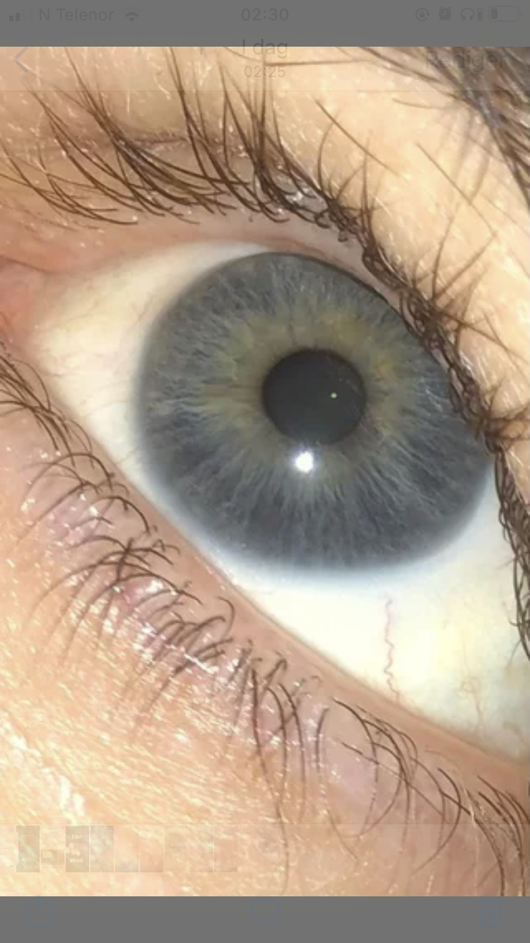 Ladythalia Skrevet 20. mars 2021 #186 Skrevet 20. mars 2021 (endret) En del av dere som lurer på fargen her inne, har det som kalles sentral heterokromi eller hazel i større eller mindre grad. Dvs én farge på ringen nærmest iris og en annen farge på den ytre ringen av øyet (heterokromi) Eller to farger som blander seg i hele eller deler av øyet (hazel) , men ikke like klart definert lagvis. Refererer altså ikke til evt limbalring helt ytterst. Den genetisk korrekte definisjonen på øyenfarge for dem med sentral hererokromi, er at det er YTTERSTE fargen som regnes som øyets ekte farge. F.eks er *ekte* grønne øyne veldig uvanlig (ca 2% av verdens befolkning, MEN det er ganske vanlig å ha en indre ring som er grønn, den kan også stråle litt utover i tegninger i den ytre ringen. Genetisk sett, er det den ytterste fargen man regner som den ekte genetisk fargen. Så godt som alle av dere som sier dere har grønne øyne her inne, har en grønnaktig ring (heterokromi) Eller en fargeblanding i grått eller blått med grønt (hazel øyne) Basisfargen/bunnfargen til de fleste her inne (også hos de som blir sure når andre ikke ser grønt) er likevel blå, grå eller blågrå etter den genetiske definisjonen. Har selv sentral heterokromi. De regnes som gråblå genetisk sett til tross for en helt klar indre grønn ring. Og nei, det stemmer IKKE som noen sier her inne, at det kun kalles sentral heterokromi når øynene er brune og grønne. Blå/grå med grønn ring eller blå/grå med brun ring er veldig vanlig. Hazel og sentral heterokromi er for øvrig ikke det samme. Hazel er når to eller flere farger sammenblandes i hele øyet. Sentral heterokromi har en klarere fargefordeling mellom to ulikt fargede ringlag som i bildet under. Endret 20. mars 2021 av Ladythalia 1