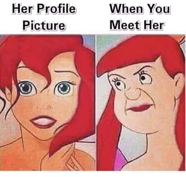 Jeg synes det går andre veien også, er ikke bare jenter som ikke ser ut som på bildene sine. Har vært på flere dater hvor menn har brukt gamle bilder og ser betydelig eldre og rynkete ut en forespeilet. Samme med vekt og hår, de legger ut bilder fra før de fikk ølvom, eller før de mistet håret. Nå liker jeg aldri en profil som kun har bilder med caps eller lue lenger for da tror jeg han prøver å skjule at han har blitt skalla 😂