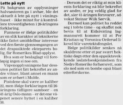 Dressing Skrevet 19. februar 2019 #8656 Skrevet 19. februar 2019 Men varetektsfengslingen måtte også prøves i lagmannsretten noen dager senere. I mellomtiden kastet politiet nye bevis inn i saken: Romerikes Blad, 18. juni 1999 "Lette på nyttPå bakgrunn av opplysninger halvsøsteren ga i avhør, ble det aktuelt å lete på nytt i våningshuset - ikke minst for å kontrollere troverdigheten i 26-åringens forklaring. Funnene er ifølge politikilder av en slik karakter at teknikerne ikke fattet umiddelbar interesse ved den første gjennomgangen av det drapssiktede ekteparets bolig, far Romerikes Blad opplyst. Hva som er beslaglagt vil foreløpig ingen si noe om. Vapenopplysningene har dessuten politiet fått bekreftet av andre vitner, blant annet en mann som er avhørt i Molde. Pistolene skal være av kaliber 22, men ifølge forklaringen til 26-åringens tidligere samboer - en 41 -arig Oslo-mann -er det ene våpenet senere byttet i en kaliber 38." ¤¤¤¤¤¤¤¤¤¤¤¤¤¤¤¤¤¤¤¤¤¤¤ Dette er rett og slet skremmende når vi vet at KK og LG satt i avhør uten advokater i denne perioden. To dophuer med abstinenser uten advokat! Det var vel da KK kom opp med sin 23/12 historie . Er det noen som vet datoen for skogturen KK og LG fikk sammen ? 1