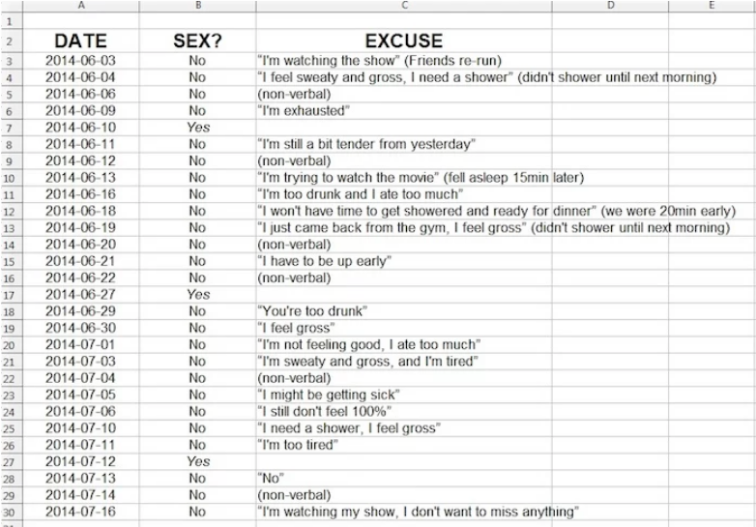 AnonymBruker Skrevet 1. februar 2019 #17 Skrevet 1. februar 2019 Jeg leste en artikkel om en fyr som lagde en excel-ark av konas unnskyldninger for å ikke ha sex, og ga den til henne. Kanskje du bør gjøre det også? Anonymkode: 8ccd4...c53 3