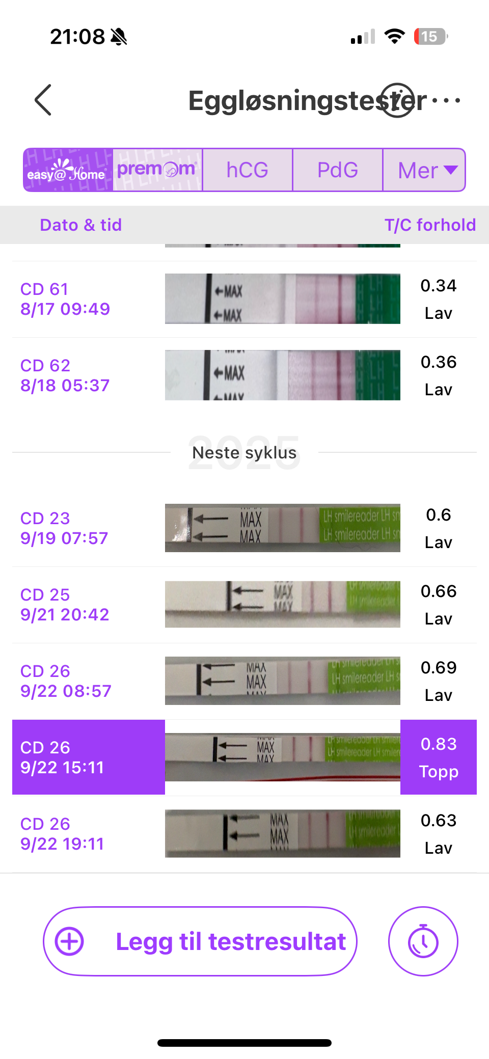 HeleneHS Skrevet 23. september #7880 Skrevet 23. september AnonymBruker skrev (9 timer siden): Posetiv?? og hva skjer med at den er posetiv så negativ? Så kjapt. Hva betyr de tallene bak der det står høy/lav? når kan jeg forvente slipp? Anonymkode: 34624...57b Jeg kjenner ikke til premom godt nok for å kunne svare på hva tallene og Kommentarene betyr, håper noen andre kan svare på den delen (jeg tror tallet er basert på hvor sterk de to streken er i forhold til hverandre). For meg ser det ut som kveldstesten dag 25 og ettermiddagsten dag 26 er positive. Ville forventet at den er negativ i dag (cd 27) hvis det faktisk var en LH topp. Egget slipper mellom 12 og 36 timer etter positiv test. De fleste produsenter anbefaler å ta tester etter kl 10, mens fertilitetsklinikkene gjerne er fornøyd/anbefaler morgenurin. Det er veldig vanlig og forventet at LH dropper raskt etter EL - da vet du at det har skjedd. Siden du har ganske lang eller uregelmessig syklus - vit at EL tester er ikke pålitelig når du har pco/s. Mange måler temperaturen i tillegg til å ta EL tester for å bekrefte (i etterkant) at de hadde en EL.