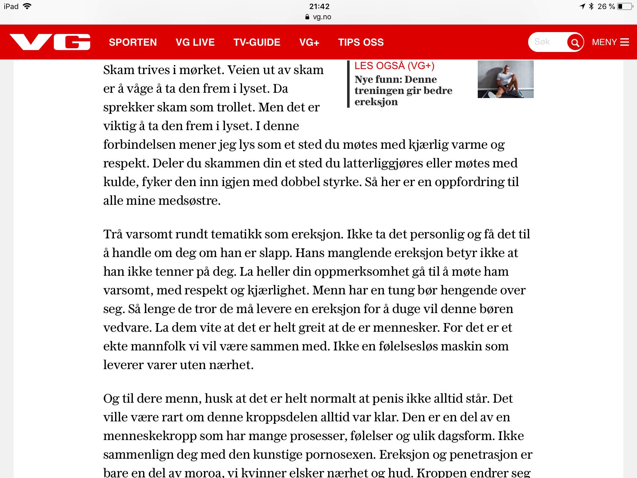 AnonymBruker Skrevet 6. mars 2019 #1 Skrevet 6. mars 2019 Penisen til daten min blir slapp under sex. Vi har hatt sex noen ganger, men ikke så alt for mange enda. Dette er sikkert noe som plager han (?) og det plager desverre meg også. Jeg føler meg ikke bra nok. Og nå "gruer" jeg meg litt til når vi skal ha sex pga dette. Jeg har også prøvd å suge han, runke han, og han har runket selv til og med, men uten å lykkes med å komme. Han kommer ikke heller. Så nå vil jeg nesten ikke suge eller runke han pga jeg vet at det ikke funker uansett. Jeg føler meg dårlig. At jeg ikke er bra nok. Hvor lang tid skal jeg gi dette? Og er det noen måte å ta det opp på? Vil ikke såre han. Har sett et annet innlegg om dette og folk skriver at man gjør det værre med å kommentere det. Men hva skal jeg gjøre da? Eller vente, ja. Men hvor lenge skal jeg vente? Hvis dette kommer av presentasjonensangst eller noe og går over etterhvert så er det jo greit. Men hvis det er et annet problem eller bare er sånn han er, så vet jeg desverre ikke om jeg kan se en fremtid med dette. Han er 31 år forresten. Anonymkode: 01954...825