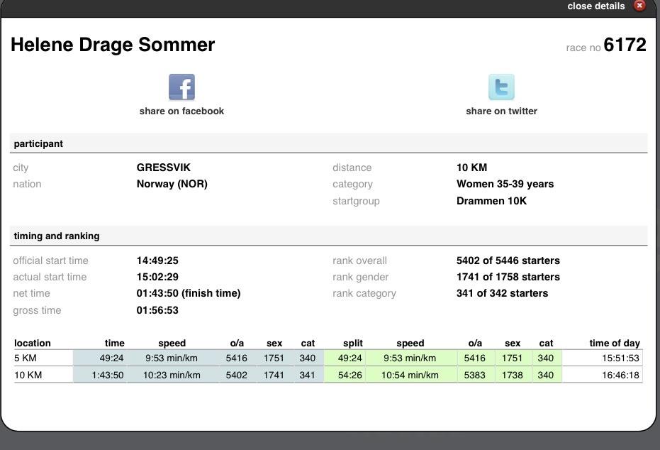 Laia Skrevet 7 timer siden #23723 Skrevet 7 timer siden Tror det går an å følge løpet (og resultatet) fortløpende her: https://live.ultimate.dk/desktop/front/index.php?eventid=7069 Finnes noen sorteringsfunksjoner på siden. Jeg er usikker på hvilken aldersklasse hun stiller i, men fant henne ikke blant de 100 ledende i klassen kvinner 35-39 iallfall. Fant henne på deltagerlisten ved søk.