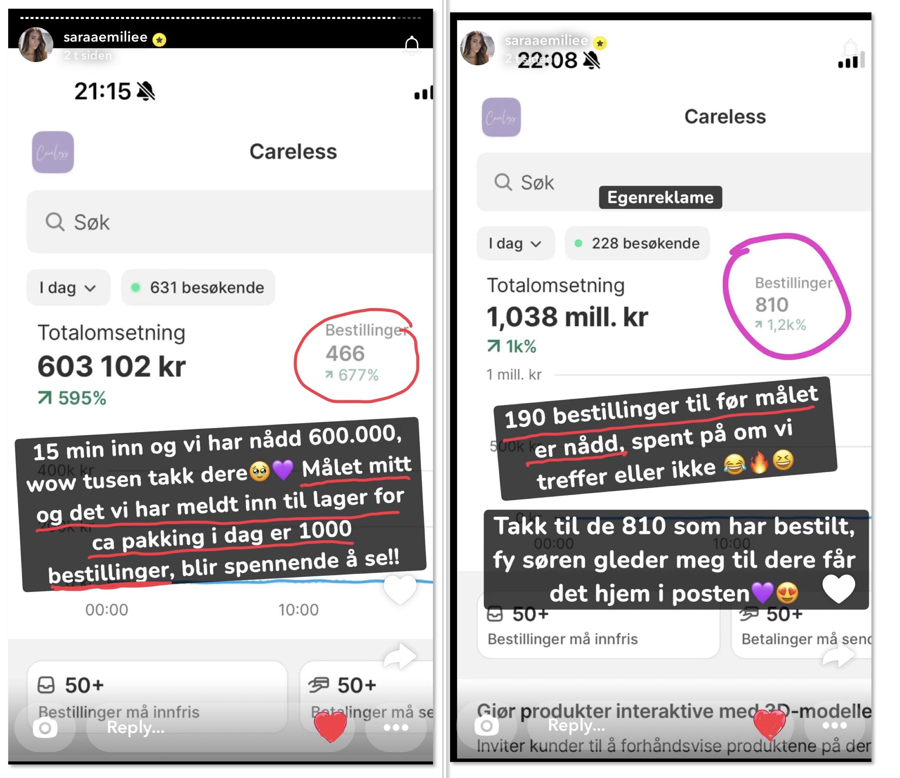 Snublefot62 Skrevet 14. april #43044 Skrevet 14. april LivEinar skrev (1 minutt siden): Droppet i går gikk ikke så bra som SET hadde ønsket seg og trodd, de nådde ikke målet hennes på 1000 bestillinger i løpet av kvelden. Begynner å får en følelse av at det er droppene alene som drar opp omsetningen i Careless. Ser vi på økningen i prosentandelen når hun viser frem dette fra dropp så har de en ganske kraftig økning i salg - kontra en normal dag. Og dersom snittet på hvert dropp er ca 1 mill + i omsetning så utgjør jo droppene en ganske stor del av omsetningen deres igjennom året. 2