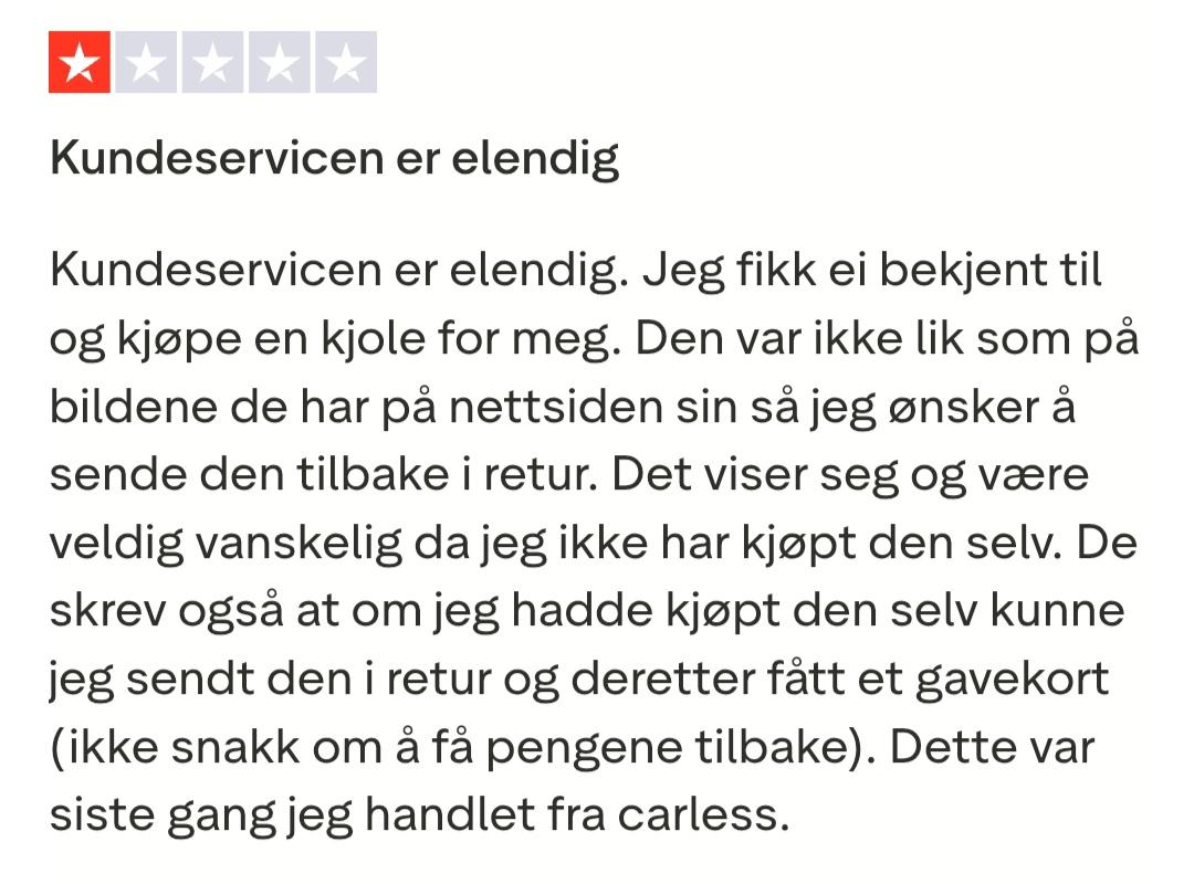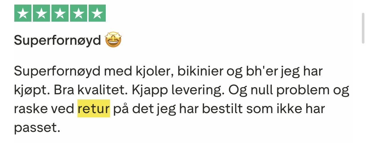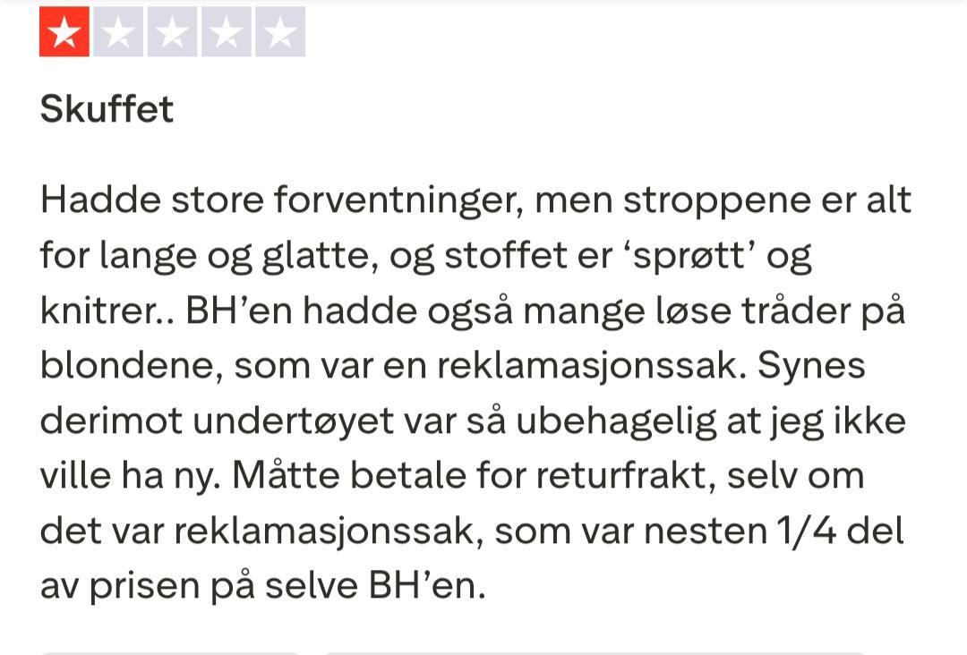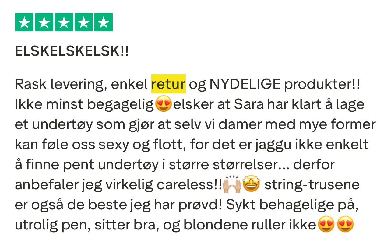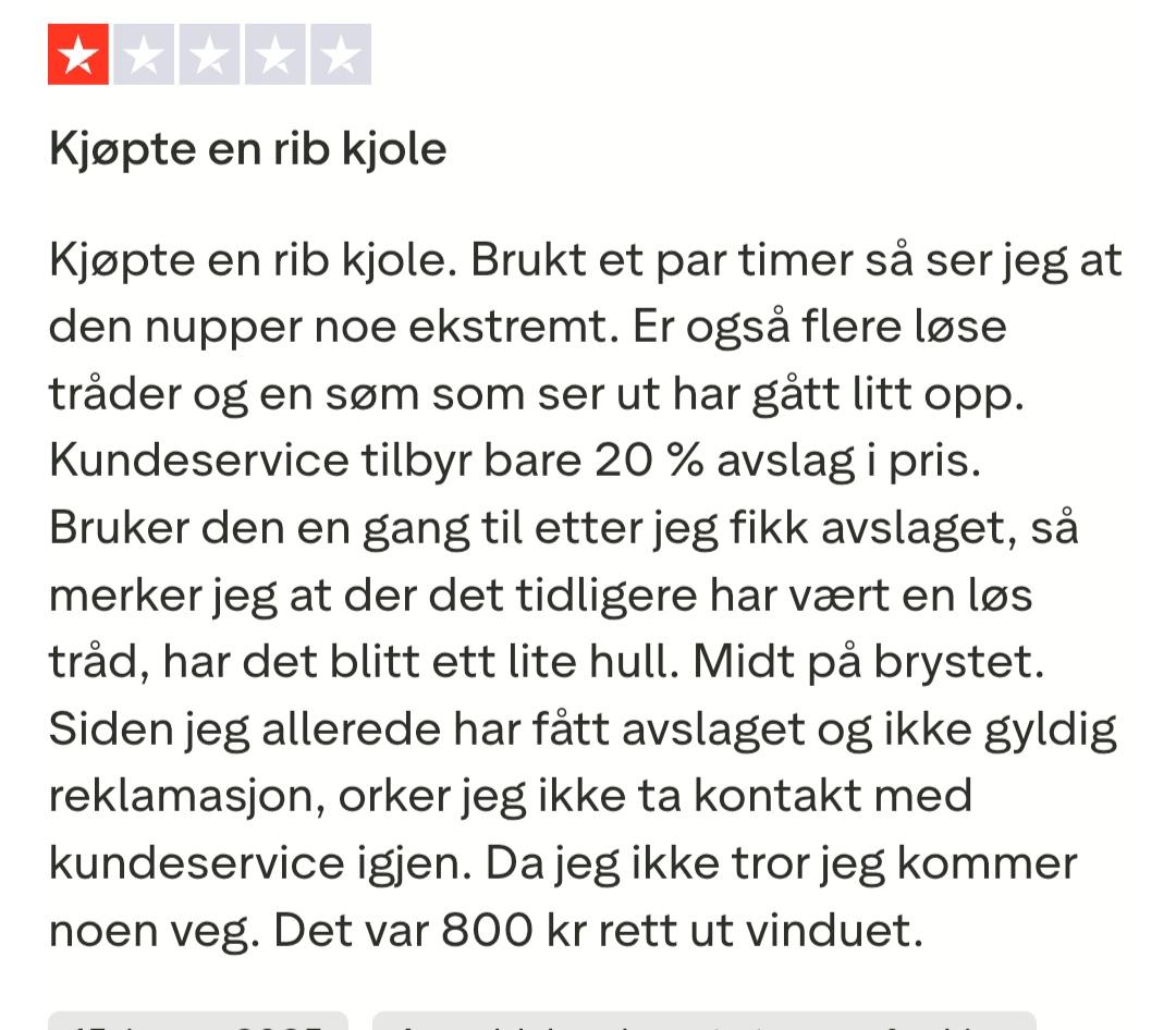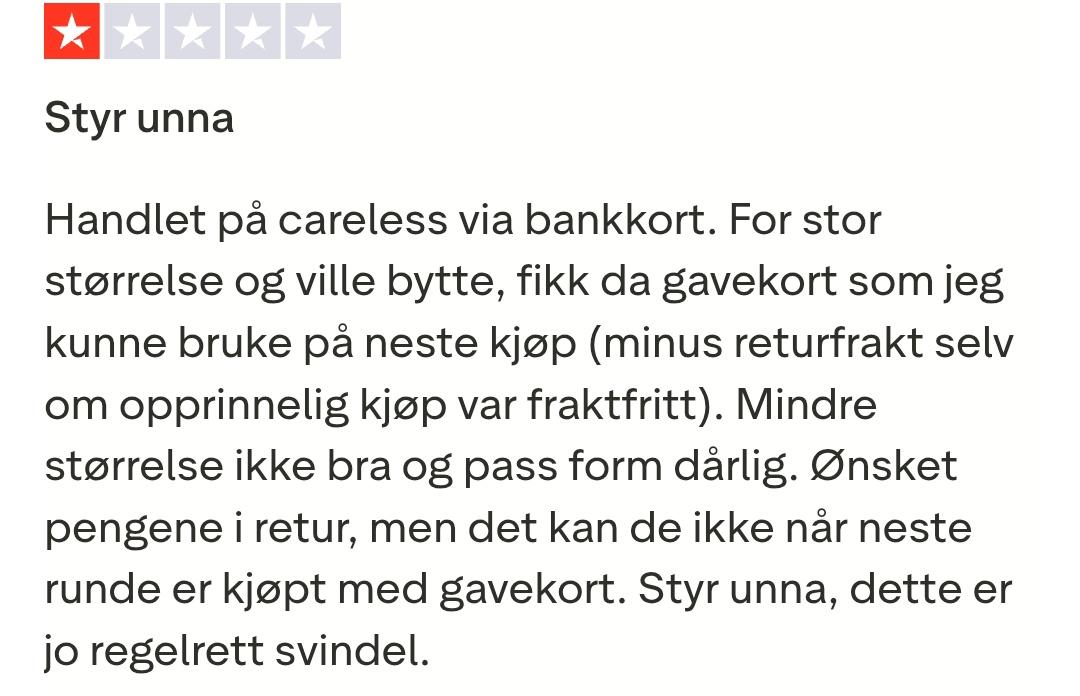Bella50 Skrevet lørdag kl. 15:48 #53426 Skrevet lørdag kl. 15:48 elskersommer skrev (24 minutter siden): Bare å sjekke Trustpilot... Gi beskjed om du trenger bilder🙂 Jeg sjekket. Det var en som ikke fikk returnere på angrefrist siden vilkårene ikke var oppfylt. Og det var en som ikke fikk angre fordi plagget luktet svette. Og det var flere som klager på frakten. Men stort sett ser det ut som det er greit å angre et kjøp. 2 3