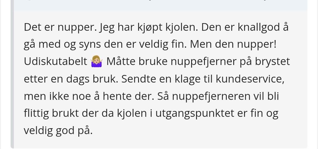 Donnap Skrevet 6. oktober #53727 Skrevet 6. oktober (endret) Jeg googlet nupper og Sara Emilie og fant dette bildet og kommentaren her inne på KG fra januar. Den tiden fulgte jeg også henne, og husker at jeg så enda bedre bevis for nupping på kjolen enn dette bildet, men neida ifølge SE var det smuler på brystet.... Jeg vurderte å kjøpe kjolen, så derfor så jeg veldig nøye etter på snappen når hun hadde på seg kjolen. Nå er dette en screenshot av en screenshot så ikke sikkert det synes like godt som det gjorde på snap. Håper jeg har lov å gjengi dette? Har tatt bort navn på de som har delt dette, og det er lett å finne her inne. Endret 6. oktober av Donnap 4 4