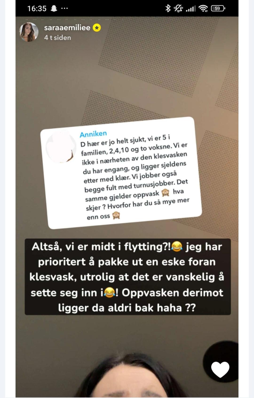 Maiken2025 Skrevet 2 timer siden #55100 Skrevet 2 timer siden elskersommer skrev (27 minutter siden): Å hvor lenge skal hun forsvare mye med at de er "midt i flyttingen"? Bildet fra SE sin Snapchat Vi er mange som har flyttet her i livet med full jobb unger osv. 😅 8