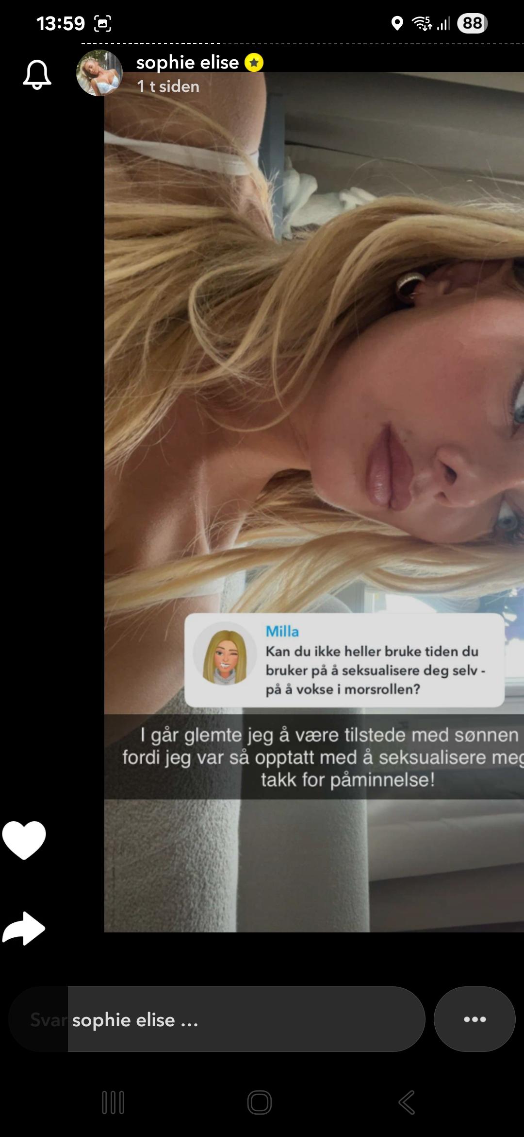 Rev. Revenge Skrevet 7. september #48185 Skrevet 7. september Til å være så lite glad i å være kjendis og helst vil være alene, så viser hun det på en besynderlig måtte ved å stille opp på reality, benytte media som mikrofonstativ, vente på Sverre Magnus med rumpa bar, vise frem puppene på café, feste, og dele seksualiserte bilder av alt fra bøker til tennisstrømper. 20 11
