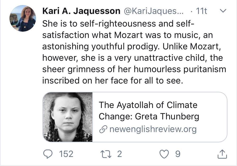 DavinaWin Skrevet 24. september 2019 #38 Skrevet 24. september 2019 31 minutter siden, Chiyo skrev: Jeg syns hun bør beskyttes fra voksne. Greit nok at voksne mennesker kan være uenig med Gretha, men det får være grenser på hva man skriver om en sekstenåring på sosiale medier. Kari er bare en av dem som totalt har mistet grepet. Å fy f**n! Håper Jaquesson blir kastet på huet og ræva ut av Twitter. Uansett hva hun måtte synes innerst inne så går det da virkelig ikke an å gå til angrep på et barn sånn som dette. Voksne dama! Sitter her lettere sjokkskadet jeg nå😳 hva folk får seg til å skrive! 29