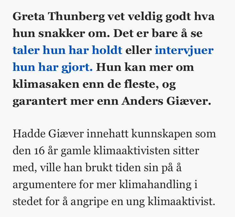 Drizzt Skrevet 26. september 2019 #100 Skrevet 26. september 2019 5 timer siden, WhiteSwan skrev: https://www.aftenposten.no/meninger/sid/i/e8mwdl/A-sette-sporsmalstegn-ved-Thunbergs-helsetilstand-er-ikke-a-vise-omsorg-Det-er-en-hersketeknikk--Simen-Bondevik Er dette ironi? Sarkasme? Spøk? Denne jenta har lidenskap, men bare det. Hun har ikke en gang fullført grunnskolen og så mener mange at hun har så mye kunnskap om noe. Det kan ikke være seriøst ment. 7