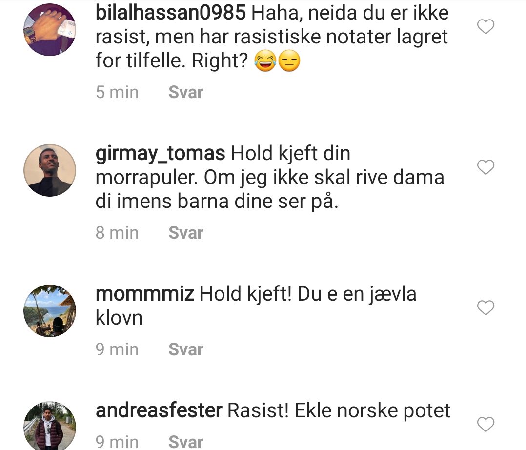 #Sunrise Skrevet 1. november 2019 #9 Skrevet 1. november 2019 14 minutter siden, BrukerErHeltAnonym skrev: Virker som om alle må bli krenket i våre dager. Lattering å politianmelde dette. Akkurat som om ikke Politiet har viktigere ting å ta seg til. Det er jo ren trussel av Tore sin kone og barn. De er uskyldigpart oppi dette. 10