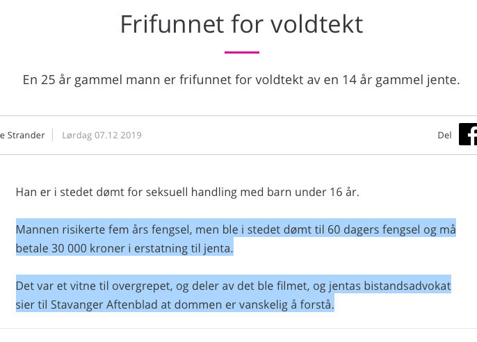 Vi vet alle det ikke var det som skjedde, men overgripere går som regel fri eller med minimalt av straff i Norge. Rettstaten i Norge er en vits, der de rikeste kan bruke sine midler til å slippe unna med advokater som bruker timesvis på saken deres, mens barn av de med mindre ressurser opplever at åpanbare seksuelle overgrep går fri. Om man tror rettsystsmet fungerer slik en ser for seg at det ideelt burde være er man naiv. Vi lever ikke i en drømmeverden, og rettstaten er langt fra rettferdig eller fungerer bra.