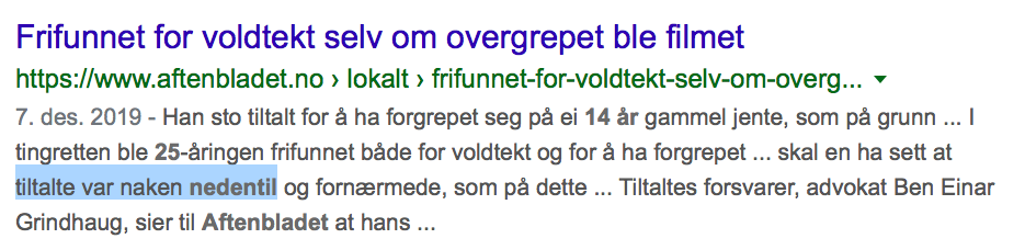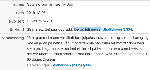Det var en annen sak fra Bergen, de var også unge. Der sto det i rettspspirene at tiltalte forklarte at offeret hadde sagt nei, og gjort motstand, han han brukt kroppstyngden til å holde henne nede. Han ble frikjent. Leste om saken i Bergens Tidene. En liten notis. Finner ikke link til dette nå, men skrev om det her inne da det sto i avisen.