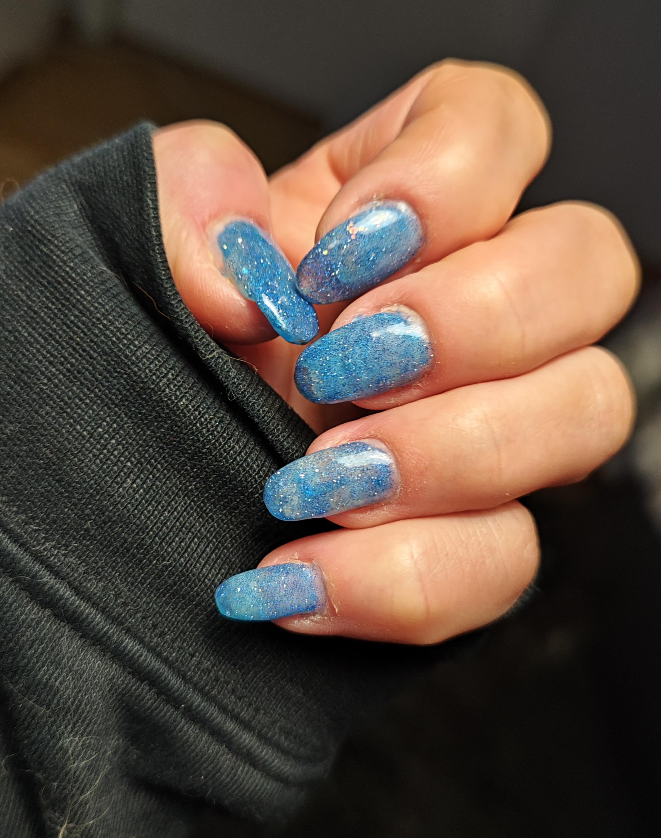 Brukt buildergel fra nailster og blandet to transparente shellakk blåfarger med glitter.
