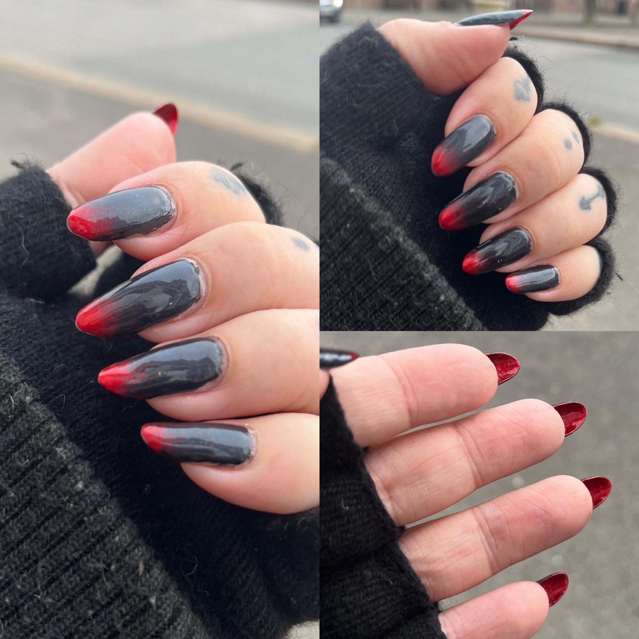 AnonymBruker Skrevet 24. oktober 2023 #1287 Skrevet 24. oktober 2023 Litt Halloween vibes! Holo taco Bat b*tch og H&M Boss in red. Og prøvde meg på å lakke undersiden av neglen for første gang 😊 Anonymkode: 550ab...20b 4 1