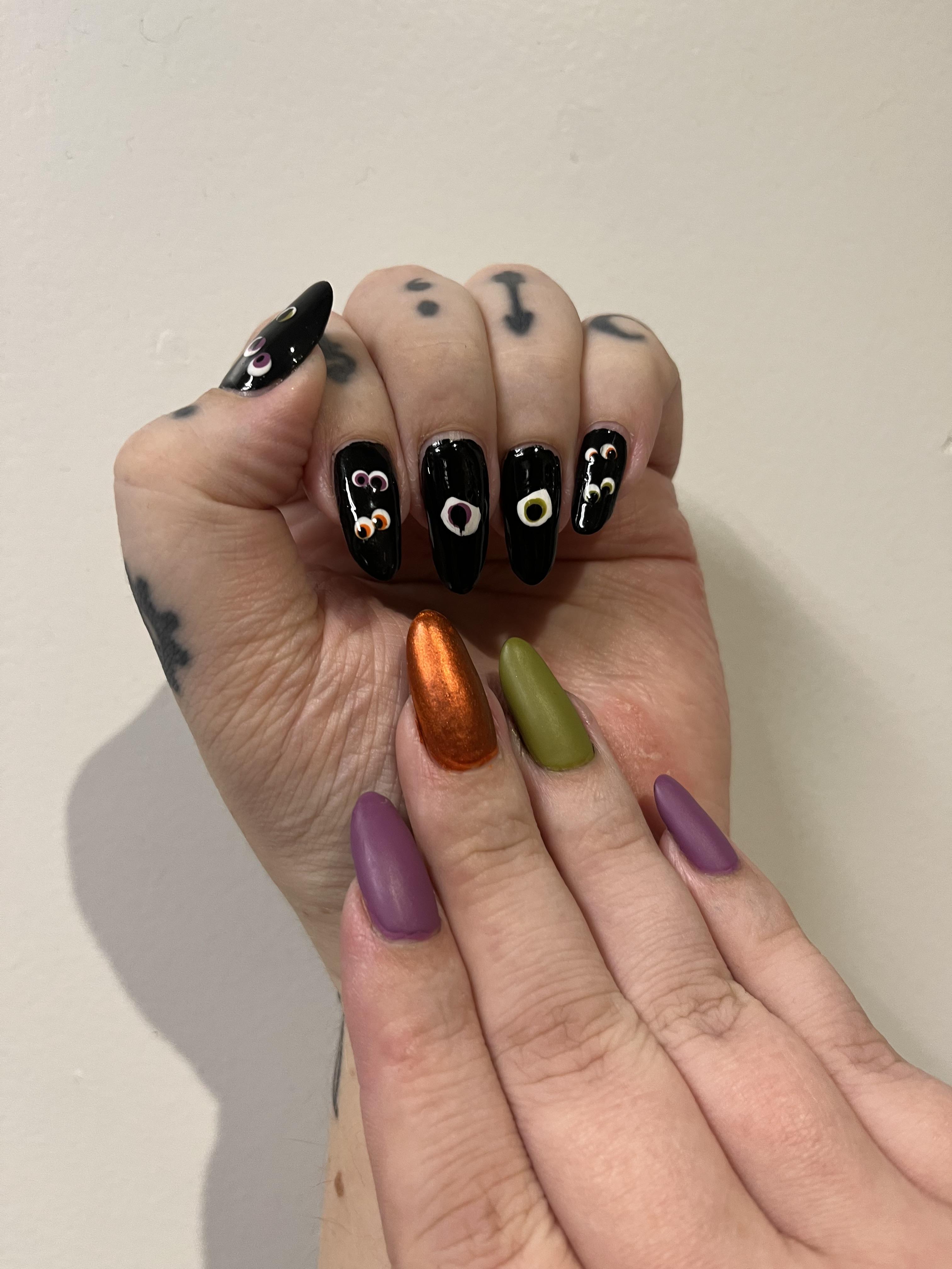AnonymBruker Skrevet 29. oktober 2023 #1295 Skrevet 29. oktober 2023 Her er mine Halloweennegler 😁 De små øynene er faktisk kjempeenkle! Det er bare en dotting tool 😊 de store øynene ble ikke så bra som jeg håpet på, men det er bra nok 😊 sort, lilla og grønn er Holo taco, orange og hvit H&M. Anonymkode: 550ab...20b 4