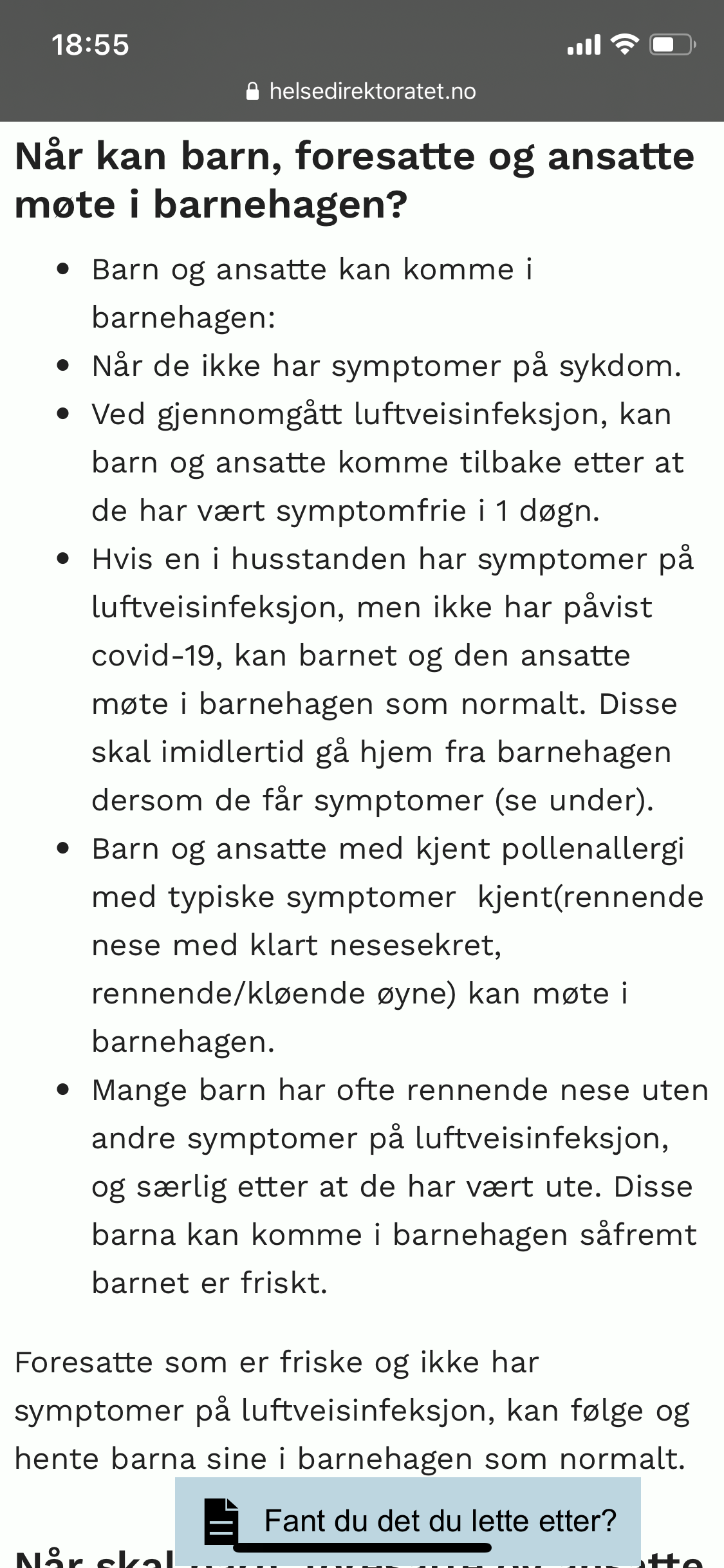 AnonymBruker Skrevet 31. mai 2020 #40 Skrevet 31. mai 2020 Klart/gjennomsiktig snørr kombinert med nys er tegn på allergi, barnet kan gå i barnehagen. Hoste er noe helt annet, og må klareres hos legen om hva det er. Hvis legen etter legebesøket sier at barnet kan gå i barnehagen, så kan barnet gå i barnehagen. Skjønner ikke problemet, gå til legen?! Er det så veldig vanskelig for trådstarter så får hun bare holde seg hjemme med barnet da. Anonymkode: 19d6f...fb8 3