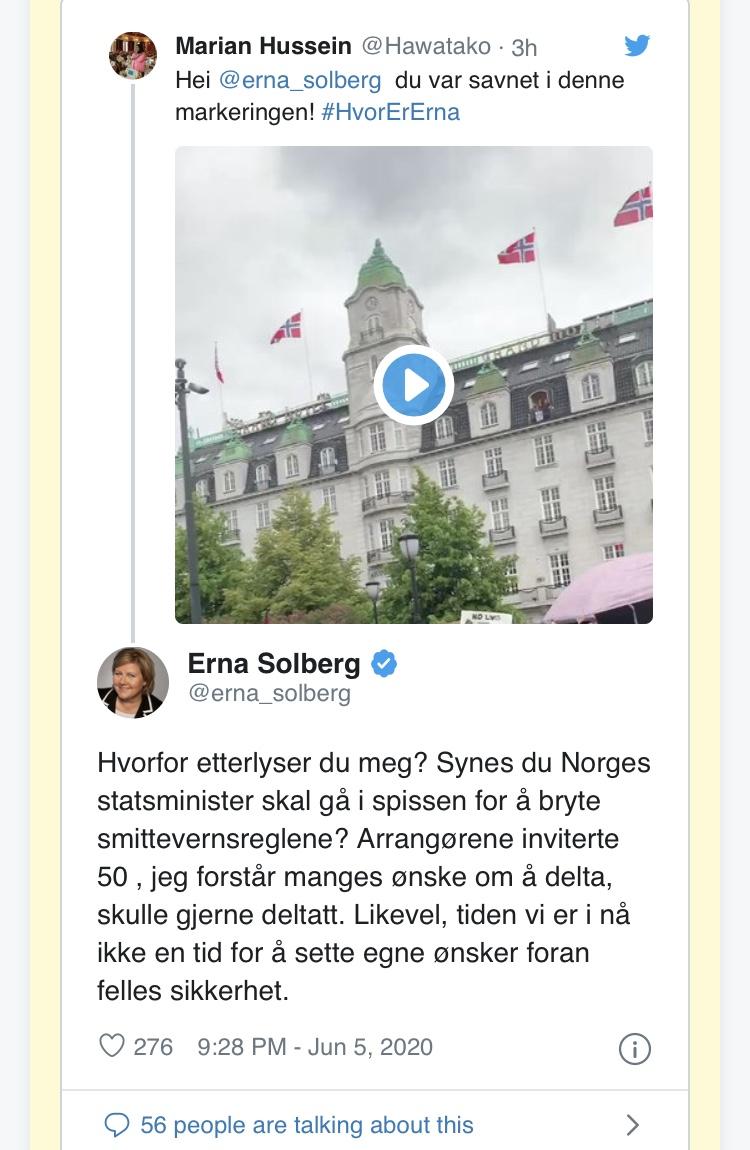 NorthernLight Skrevet 5. juni 2020 Forfatter #228 Skrevet 5. juni 2020 Bra svar av Erna til SV politiker Marian Hussein. 24