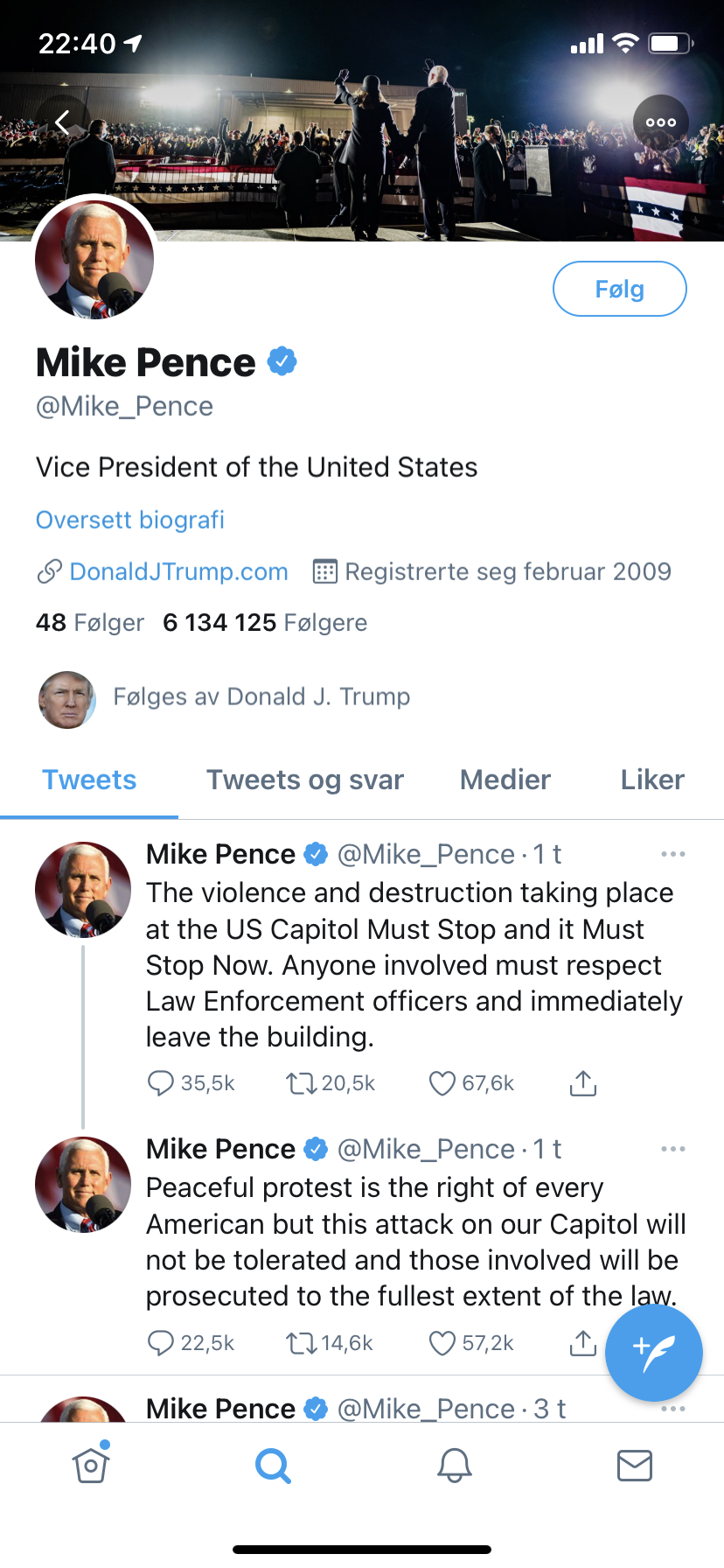 Pingvinboogie Skrevet 6. januar 2021 #214 Skrevet 6. januar 2021 Og der hadde Mike Pence byttet bakgrunnen sin på twitter til et bilde av Biden og Harris. Hva i alle dager? 4