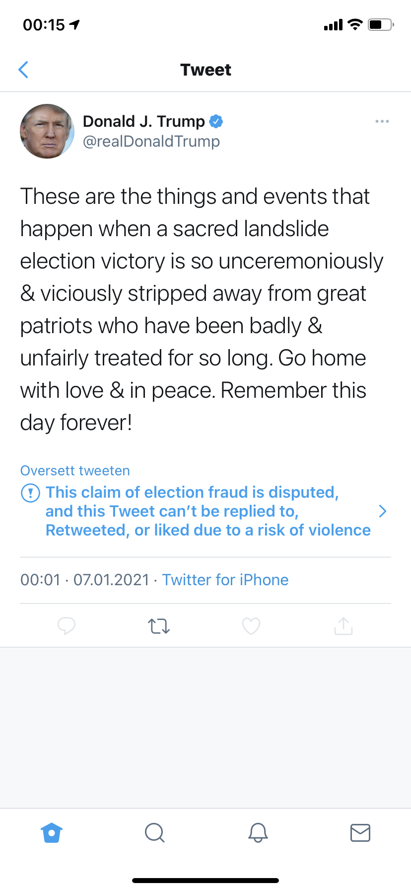 Gjest Dr.Oetker Skrevet 7. januar 2021 #295 Skrevet 7. januar 2021 Twitter har stengt Trump fra å tweete i 12 timer, og de to siste er sletta!