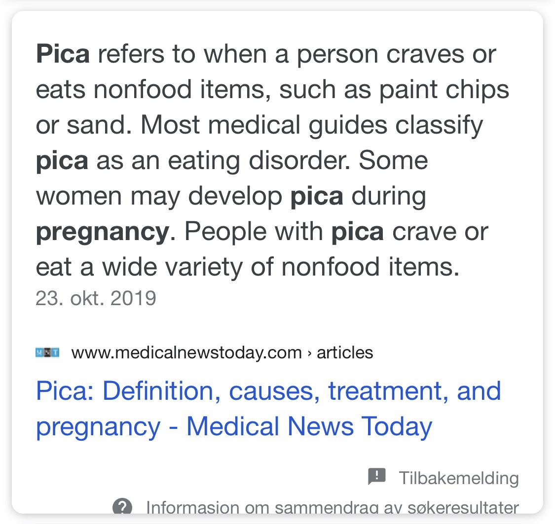 AnonymBruker Skrevet 22. november 2020 #11 Skrevet 22. november 2020 7 minutter siden, AnonymBruker said: pica er jo lysten på å spise ting som ikke er fordøyelige. Jeg foreslår en henvisning fra din fastlege for utredning på vpp. Anonymkode: 3a371...664 Nope pica kan være lukter som en for dilla på i svangerskapet https://www.klikk.no/produkthjemmesider/bam/spro-svangerskapsdilla-2911681 Anonymkode: a5d13...66f 1