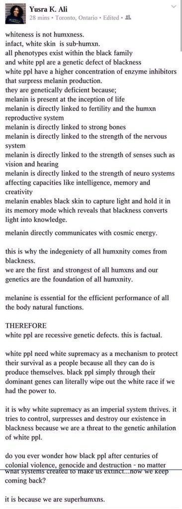 Ichiko Skrevet 9. desember 2020 #15 Skrevet 9. desember 2020 (endret) Hvis forhold i Nord-Amerika skal ha så mye å si for Norge, så kan vi se på hva Lederen for BLM i Toronto, Yusra K. Ali, mener. (NB. Ordet "humxn" i teksten betyr da "human", "ppl" betyr "people") Og jeg som trodde det var rasistisk å tillegge mennesker forskjellig verdi pga. hudfarge. Endret 9. desember 2020 av Ichiko