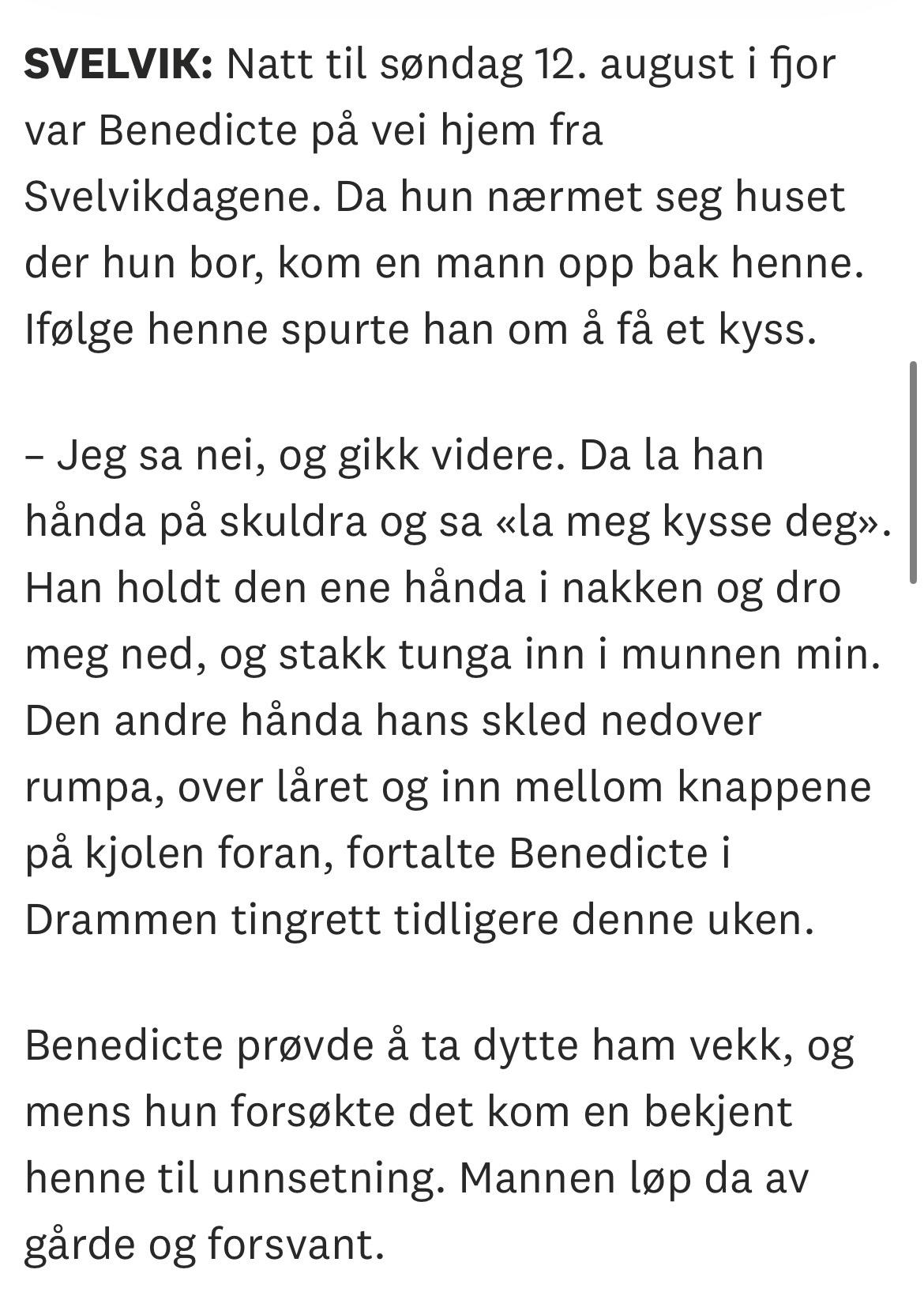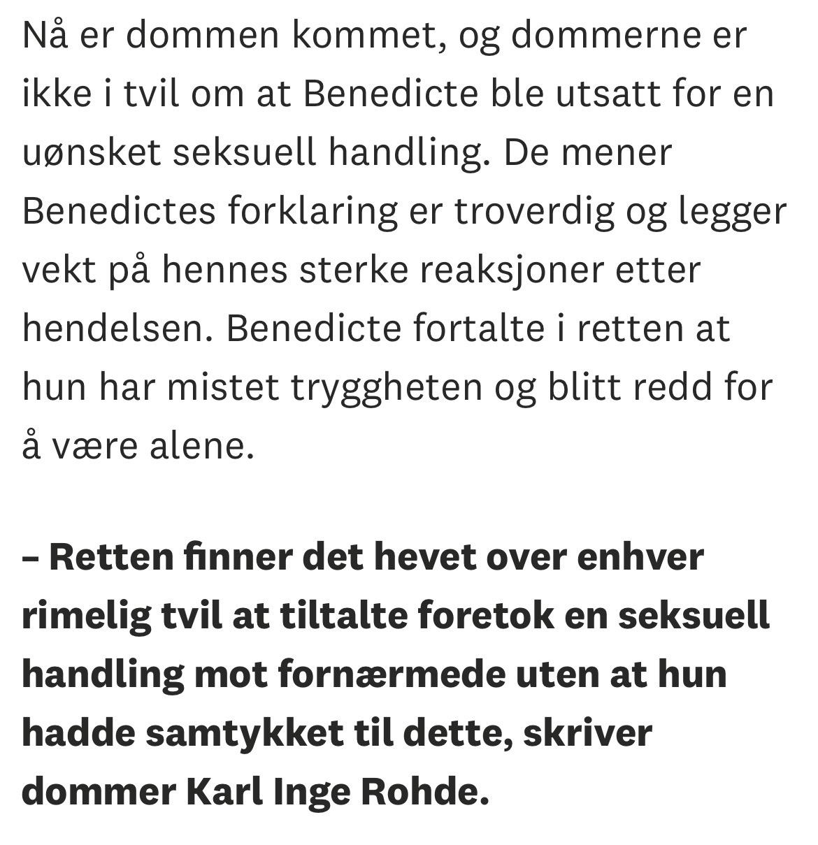 Møffins Skrevet 5 timer siden #2961 Skrevet 5 timer siden (endret) I kommentarfeltet hennes på Instagram svarer hun Linnea med: «Han som ble dømt for voldtektsforsøk på meg fikk typ 10.000 kroner i bot.» Det jeg reagerer på er at dette ikke samsvarer med det som faktisk står i dommen. Retten skriver at det var en seksuell handling uten samtykke, og at handlingen lå i nedre sjikt. Han ble dømt for seksuell handling, ikke for voldtekt eller voldtektsforsøk. Nok en gang overdriver hun og lyver. Og jeg er ganske sikker på at Linnea siktet til Høiby-saken, og ikke BH sin egen opplevelse😂 Flaut at Benedicte drar inn sin egen greie når noen kvinner der ute står ovenfor noe så alvorlig som å faktisk ha blitt voldtatt, på ekte. Det betyr ikke at det hun opplevde ikke var alvorlig. Retten slo fast at det var en straffbar handling. Men det er en klar juridisk forskjell på seksuell handling og voldtektsforsøk. Når hun bruker begrepet «voldtektsforsøk» i kommentarfeltet og samtidig sammenligner dette med sin egen bot, så blir det en sammenligning som bygger på en feil beskrivelse av hva dommen faktisk gjaldt. Begreper betyr noe. Spesielt når man selv argumenterer hardt for rettferdighet. Dama er helt ute å kjører og det er sykt at ingen tar henne på det. Endret 5 timer siden av Møffins 3