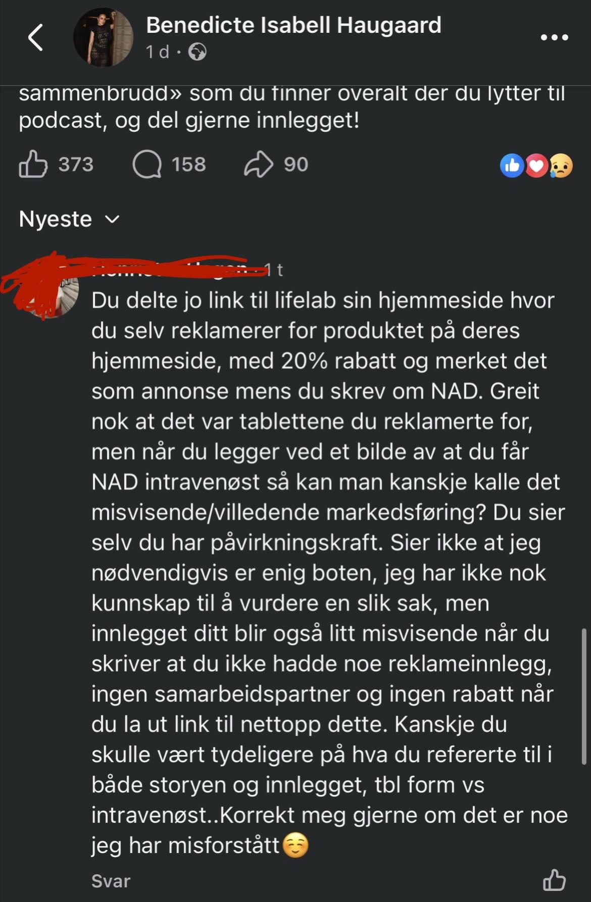 Akkurat lite villig til å sette deg inn i lovverket som Benedicte - vi så hvor bra det gikk, «er ikke reklame» sa dama, og så satt hun igjen med en bot på 750 000,- for å ha reklamert for NAD. Les vedtaket, så skjønner du kanskje at man ikke trenger å ha fått betalt eller hatt andre goder før det sees på som reklame. Det holder med at man som influenser går offentlig ut og omtaler et produkt eller tjeneste på en slik måte at forbrukere kan bli påvirket av omtalen. Omtale kan være muntlig, bilde, video eller tekst.