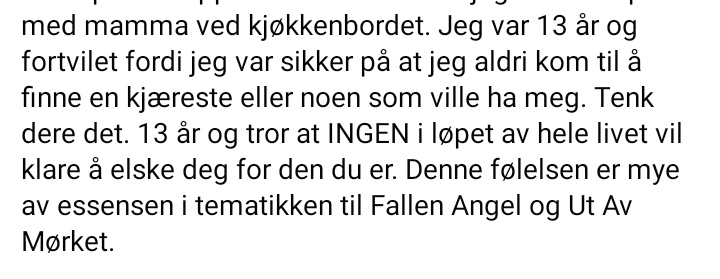 AnonymBruker Skrevet 23. mai 2021 #64 Skrevet 23. mai 2021 AnonymBruker skrev (16 minutter siden): La oss se litt her. I første bilde sier tix at "tenk å være 13 år og føle det sånn". Dette er helt vanlige tenåringsfølelser. Jeg har hørt dette fra mine tenåringer som ikke hadde tics og. Tix har sparket inn vidåpne dører og er en mediemanipulator av rang. Og Europa kjøpte det ikke. Bilde nummer to er hentet fra en nyfrelst tix'er. Det er bred konsensus i det feltet om at tix burde vunnet pga "han er så bra fyr og sangen er så bra". Tix selv vet at sangen er middelmådig på sitt beste. Så ja. Jeg er enig med deg ts. Anonymkode: b8bd1...a21 Når han får tilbakemeldinger som dette, sier det kanskje litt om at han betyr noe for veldig mange? Heldigvis blir ikke flertallet av 13-åringer i Norge mobbet for noe de ikke kan noe for. Den samtalen han nevner har nok sikkert skjedd flere ganger for han og mange andre med diagnoser, og husk at mange av disse har ikke venner heller. Det er en stor forskjell. Anonymkode: 27fa6...c88 2