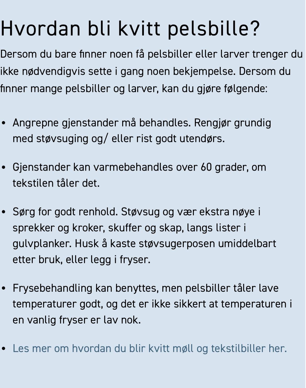 AnonymBruker Skrevet 31. august 2025 #39 Skrevet 31. august 2025 AnonymBruker skrev (2 timer siden): Det finnes en metode skadedyrfirmaer kan bruke men det koster endel- fra 10.000 kr. Et firma kan ta med alt som kan vaskes et sted og fryse det i store frysere- og med kjøligere temperaturer enn i vanlige frysere man har hjemme i fryseren. Kulde dreper larver og biller. Men det må være ganske kaldt. Hvis det blir over 15 kuldegrader noen dager denne vinteren man man prøve å putte klær osv. i poser og sette på feks verandaen noen dager. Anonymkode: 522cb...0b4 Det hjelper jo ingenting. Tekstiler - selv møbler - har vi kontroll på. Grunnen til at de kommer tilbake i bølger er at de ligger under parkett, under sokkler, bak et skap mot veggen..... Anonymkode: c562c...6c9 1