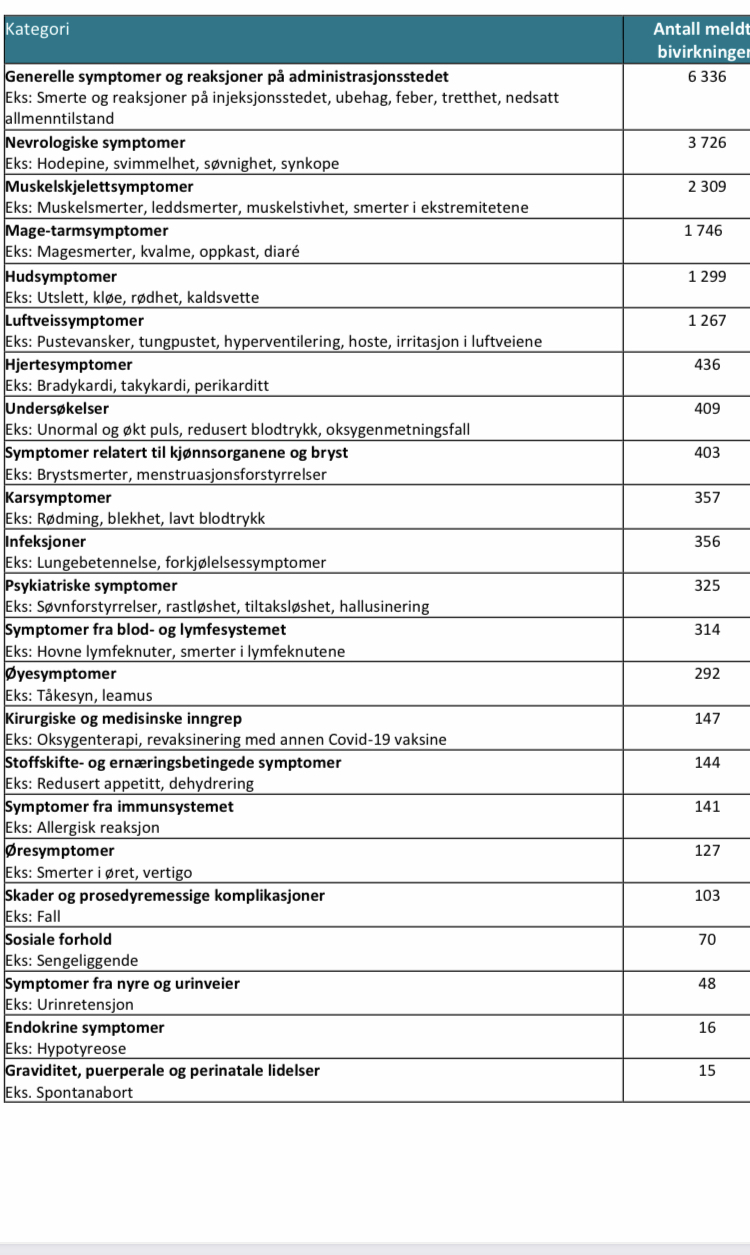 Gjest Saph Skrevet 5. august 2021 #13 Skrevet 5. august 2021 juni skrev (23 minutter siden): Men jeg spør ikke de fleste, jeg spør de som har fått hodepine, tåkesyn o.l Jeg VET at det ikke gjelder de fleste! Jeg spør ikke de som fikk litt vondt i armen heller. Ts Hvordan skal man kunne vite at "og lignende" ikke inkluderer vond arm?
