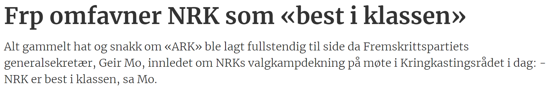Gugglo Skrevet 1. september 2021 #29 Skrevet 1. september 2021 Drizzt skrev (På 30.8.2021 den 21.03): Har du lest i lenken hvor det står satiriks? Vet du hva satire er? Hun oppfordret Extinction Rebellion deltakere å klippe seg og få seg en jobb Helt med rette. Men NRK er en blodrød media som vi dessverre alle er pålagt å sponse med mange blodrøde journalister som presterer for å fremstille Frp i et negativt lys. Triste saker, men slik er NRK. Solvang er et unntak - han gjør jobben sin bra. P.S. Fremskrittspartiet er nok det eneste partiet som får navnet sitt endret på NRK til Fremstegspartiet. Når begynte NRK med å oversette navn? https://nn.wikipedia.org/wiki/Framstegspartiet Ellers heter Høyre Høgre på nynorsk, Kristelig Folkeparti heter Kristeleg Folkeparti på nynorsk, Miljøpartiet de Grønne heter Miljøpartiet dei Grøne på nynorsk, Norges Kommunistiske Parti heter Noregs Kommunistiske Parti på nynorsk og Rødt heter Raudt på nynorsk. For øvrig har FrP en litt annen holdning til NRK enn du har. https://journalisten.no/frp-omfavner-nrk-som-best-i-klassen/249086