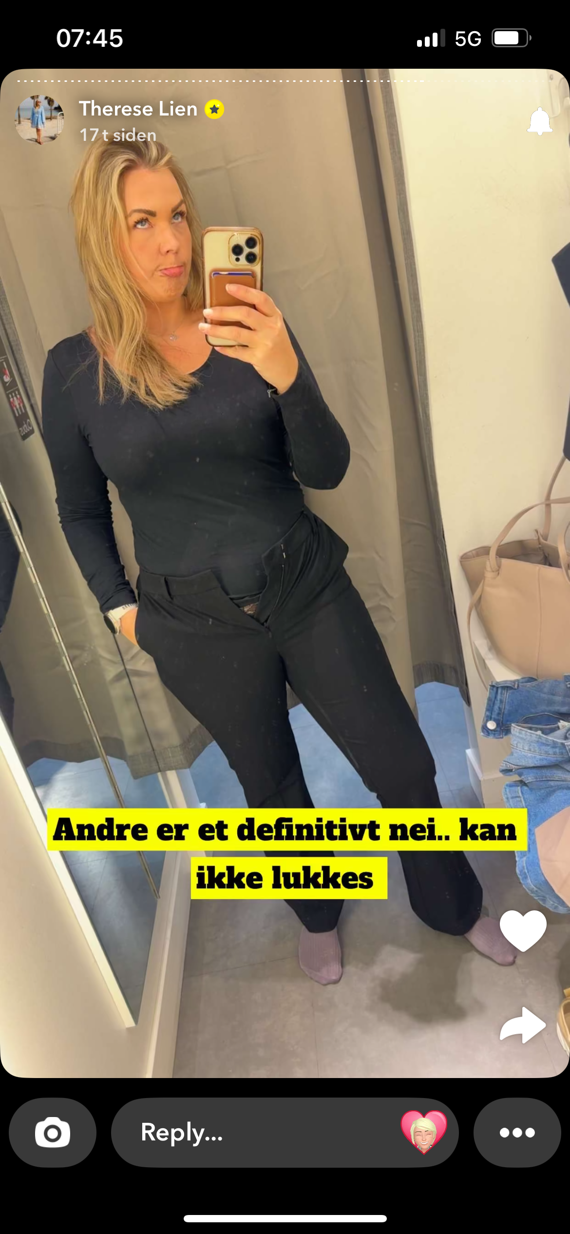 elskersommer Skrevet 16. mars #6345 Skrevet 16. mars Dorisdott skrev (3 timer siden): Joda… den kan lukkes, om du går opp en str eller to🫣 Skjønner hun ikke att det er en str for liten? 2