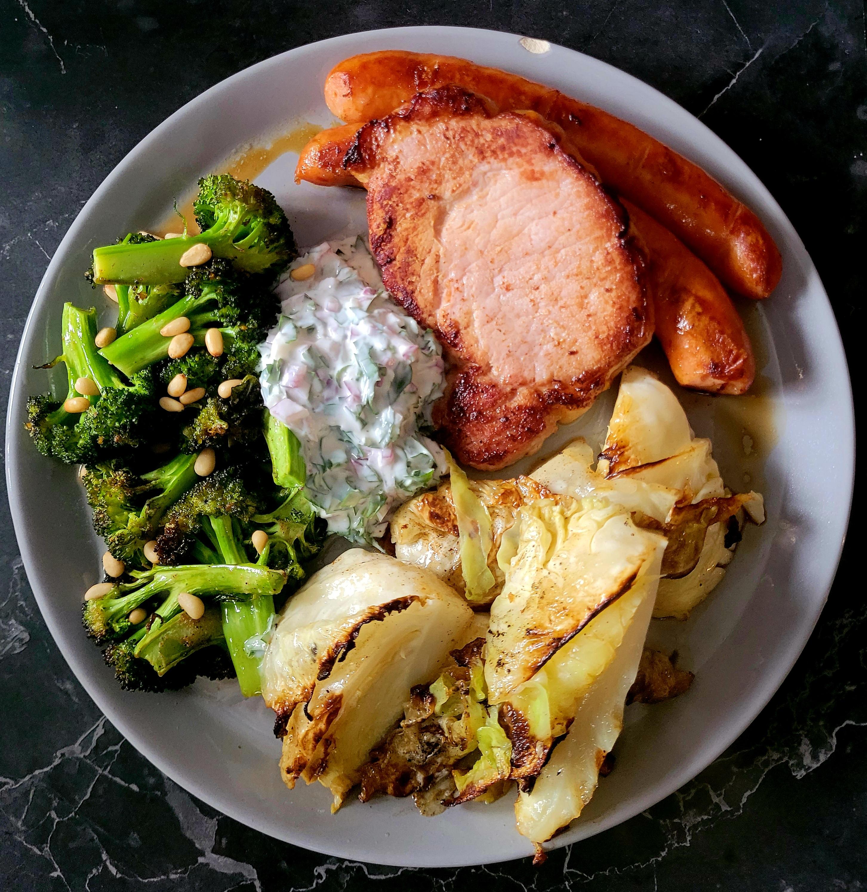 jannihj92 Skrevet 26. juni #8581 Skrevet 26. juni Skulle egentlig grille i dag, men så snudde været helt 🙄 Det ble fortsatt det samme til middag, men måtte lage det inne i stedet. Sommerkotelett, pølse, ovnsstekt brokkoli med litt forskjellig krydder og pinjekjerner, pannestekt spisskål og en yoghurtdressing med masse persille, sitron, rødløk, hvitløk, salt og pepper. Jordbær med fløte til dessert. 6 6