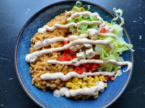 Fremdeles badstue her inne, fant en gryterett rest i fryså, laget gryterett bowl, med isberg, mais, søt paprika, vårløk, salatost og toppet med chipotle maio.
