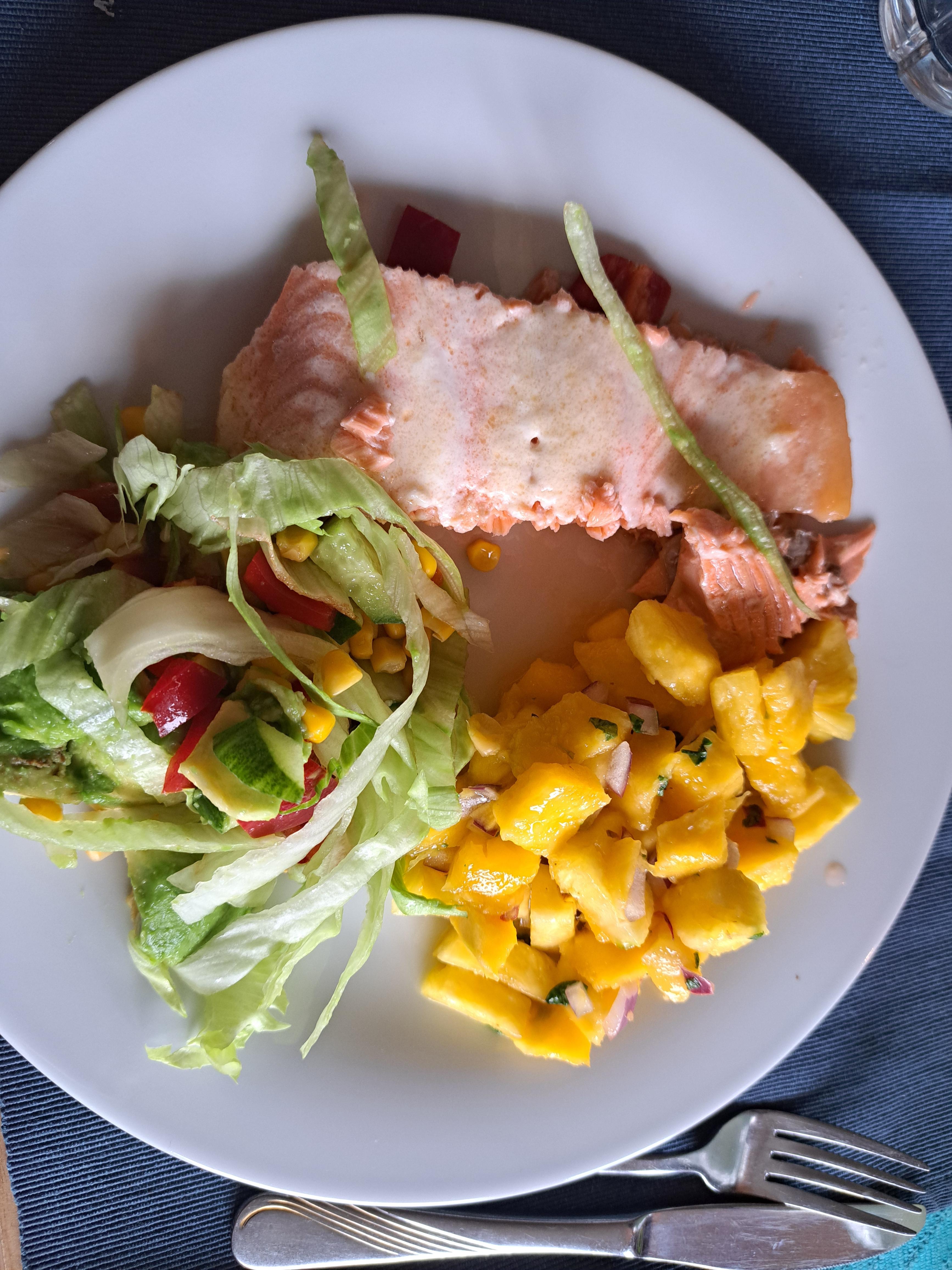 Kokos og limemarinert ørretfilet, salat og ananassalsa