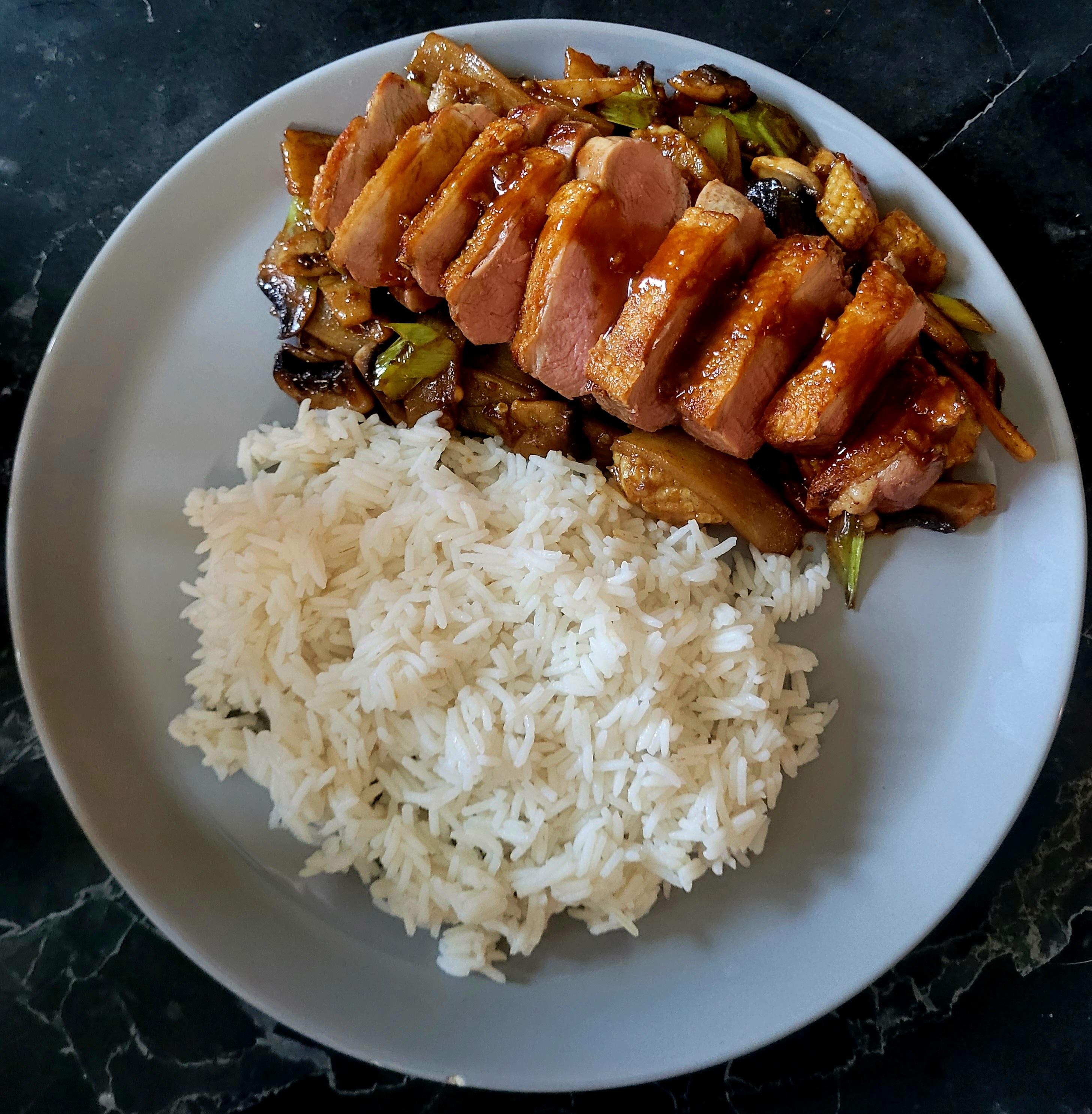 Asiatisk uke fortsetter! I dag har jeg laget kinesisk hoisin-and. Rosastekt andebryst med sprøtt skinn, en blanding av sjampinjong, purreløk, bambusskudd og minimais, en hoisin-basert saus og kokt ris.