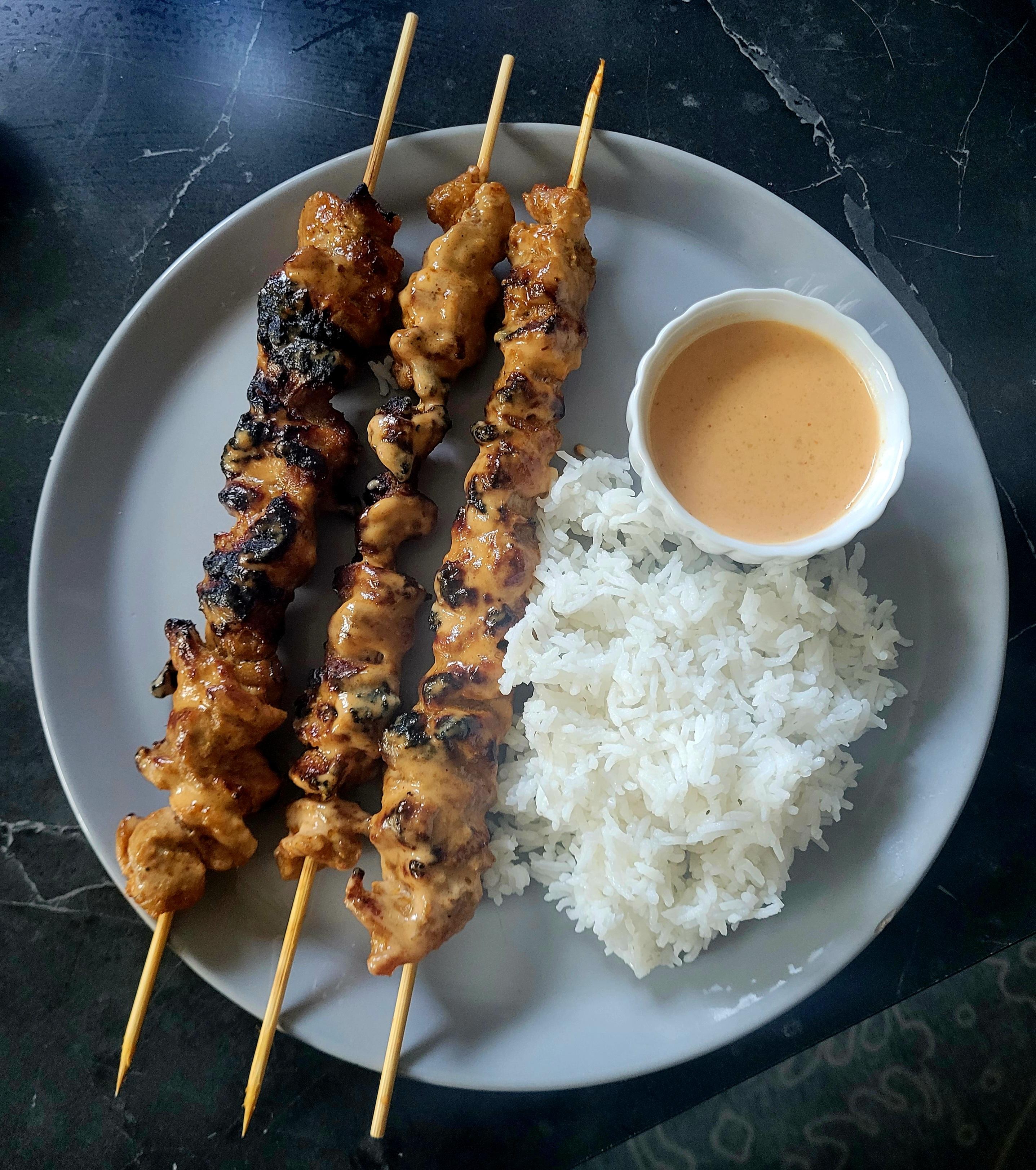 Asiatisk uke nærmer seg slutten, og i dag har jeg hatt broren min på middag. Vi har laget grillspyd med satay-saus. Planen var egentlig å grille ute idag, men det er så hinsides varmt at vi droppa det og heller brukte den elektriske grillen inne i aircondition-luft 😅 Kjøttet er nakkekoteletter som er strimlet og marinert i en blanding av rød karripasta, olje, sukker, karripulver og litt salt. Grillet på innegrillen og penslet med satay-saus når ferdige. Kokt ris ved siden av + ekstra saus. Grønnsakene glimret med sitt fravær i dag, men vi tar det på lørdagskvota.