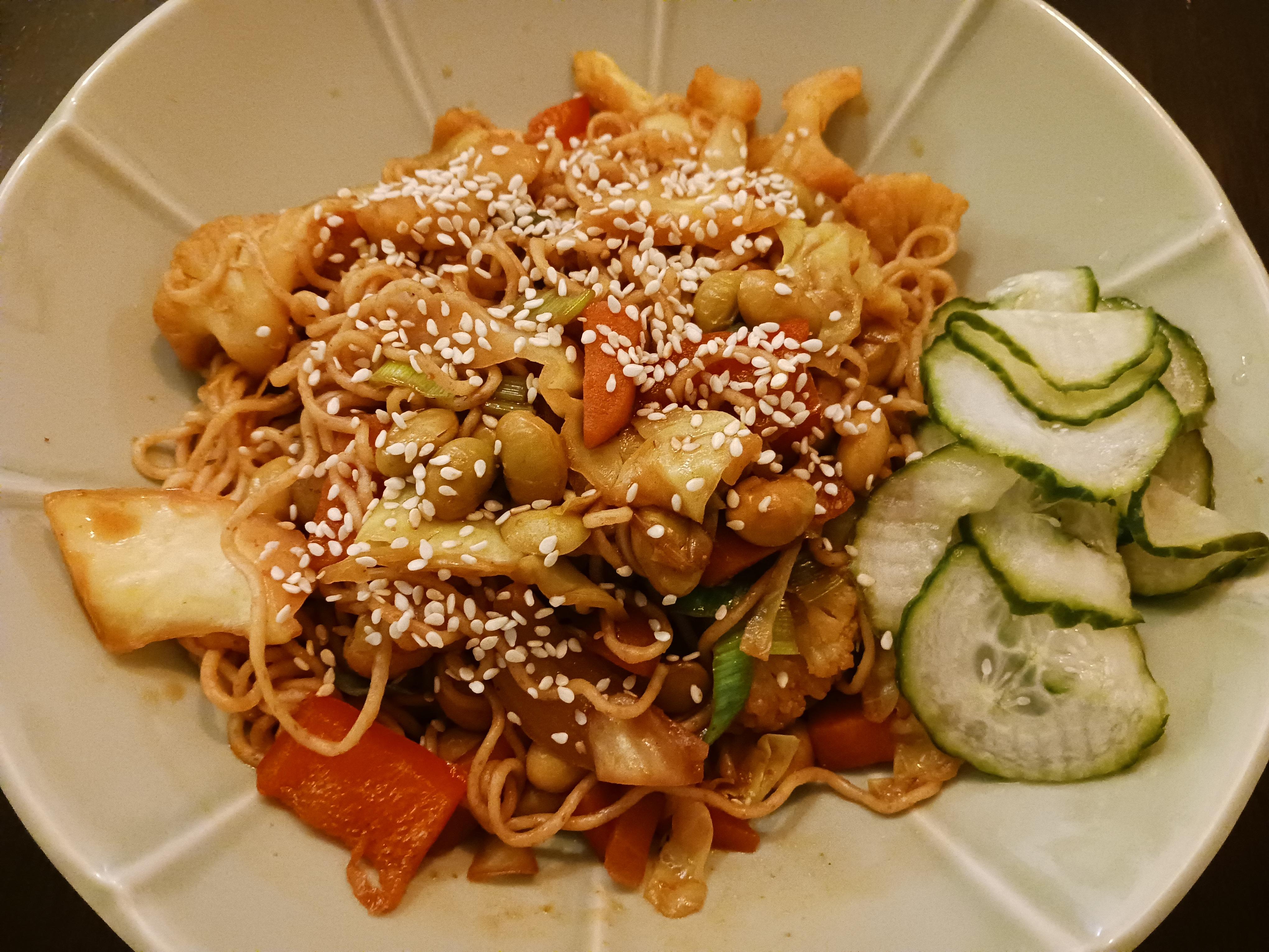 AnonymBruker Skrevet 30. september #9000 Skrevet 30. september Fullkornsnudler med grønnsaker og edemamebønner i en karribasert saus. Marinert agurk og sesamfrø. Anonymkode: 5b50f...7e4 3 2