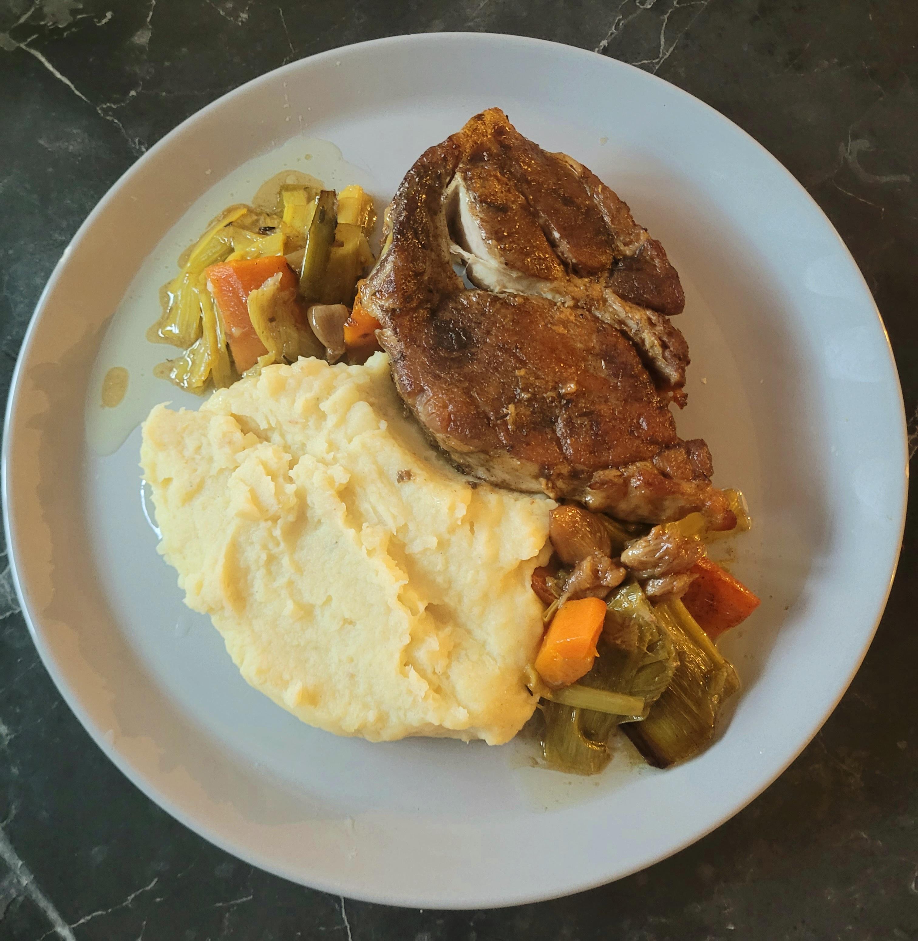 jannihj92 Skrevet 1. oktober #9005 Skrevet 1. oktober Hadde en hel nakkebit av svin i fryseren! Den delte jeg opp i koteletter, brunet dem kjapt i stekepanne, og langtidsstekte dem sammen med noen slitne grønnsaker (gulrot, sellerirot, squash, løk, hvitløk og purreløk) i ildfast form under folie. Hadde hjemmelaget potet/sellerirotmos ved siden av. Kjøttet ble så mørt at jeg kunne spist det med skje! 😁 2 3