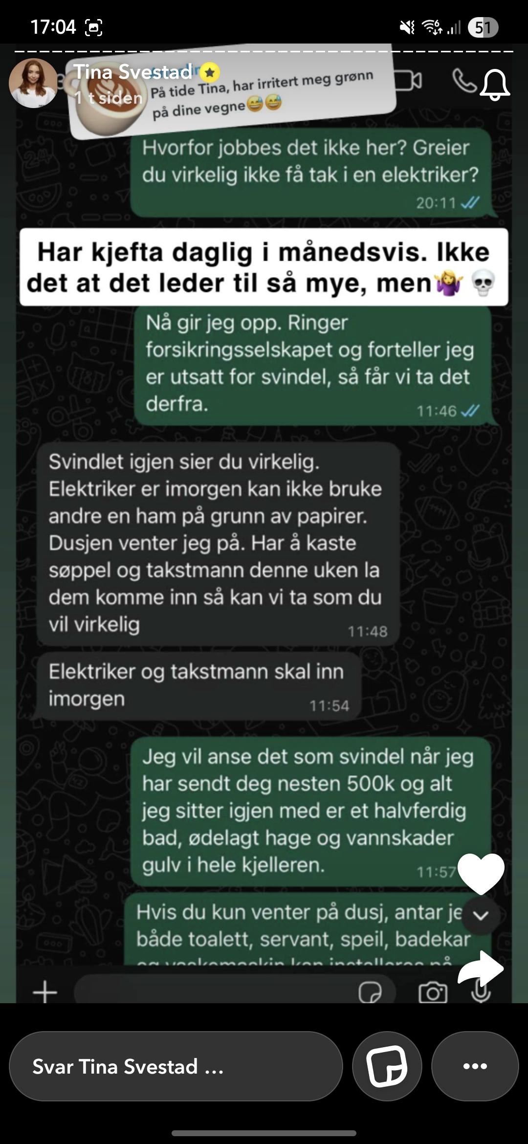 Vegglampe Skrevet lørdag kl. 17:47 #604 Skrevet lørdag kl. 17:47 Sammy! skrev (7 minutter siden): Det er helt lov å bli irritert, sint og utålmodig, men å kalle et annet menneske en lat, ubrukelig jævel er noe av det verste jeg har hørt. At hun ikke skjemmes. Helt enig. Fikk sjokk når jeg lese meldingene hun sendte håndtverkeren. Jeg har fullstendig forståelse for at hun er drit lei, med god grunn. Men den tonen tar man ikke mot et annet menneske! Uansett rart å bare betale 500 000kr uten at badet er ferdig. Normalt er å betale litt underveis før siste rest blir betalt når alt er ferdig! 12