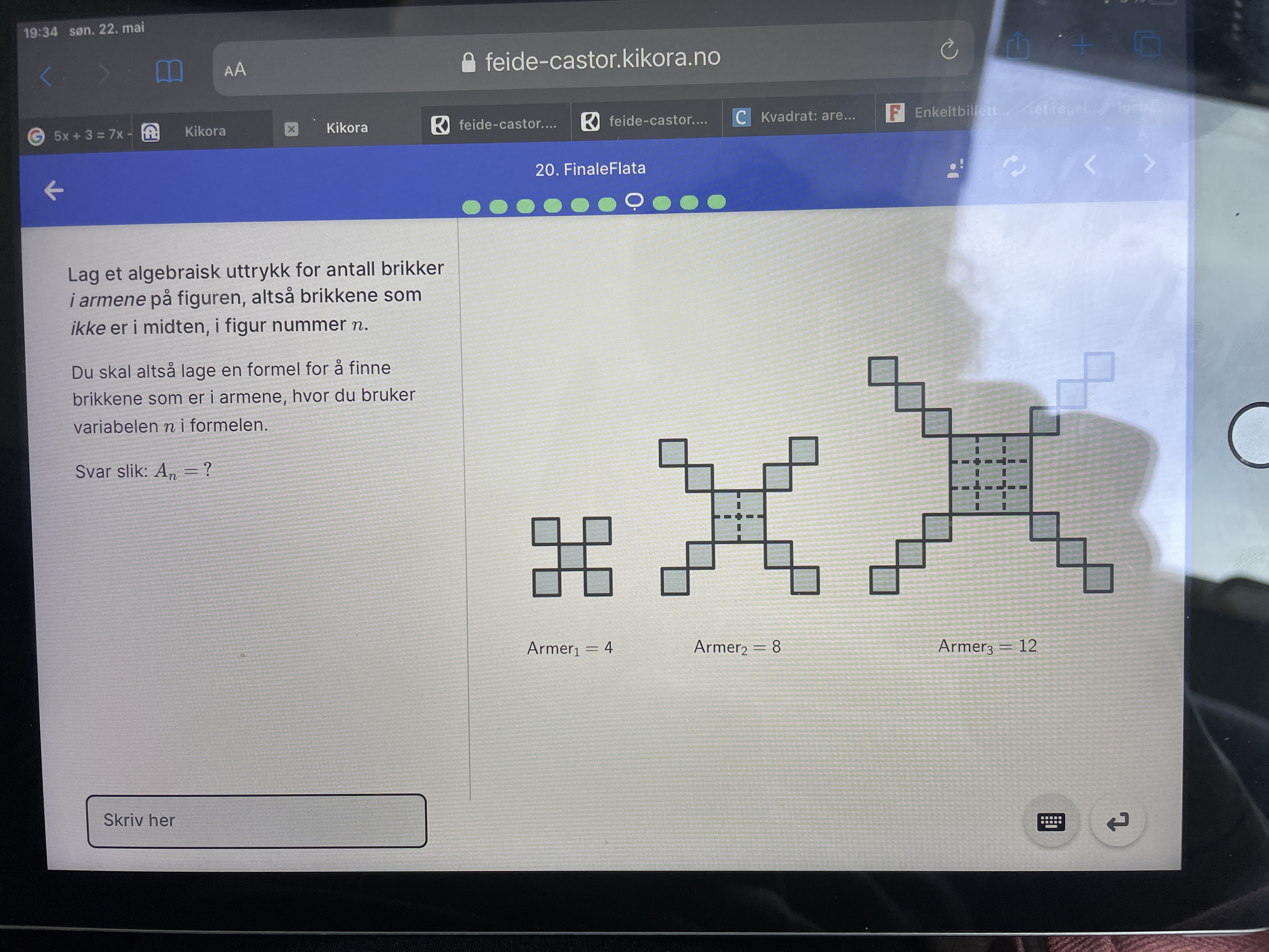 Nima2019 Skrevet 22. mai 2022 Forfatter #10 Skrevet 22. mai 2022 Knoot skrev (3 minutter siden): Jeg ser på det bildet som ligger i denne tråden. Er ikke det riktig at n^2 gir det alltid antall figurer i midten for hver figurtall? 1^2 gir 1 boks, 2^2 gir 4 bokser og 3^2 gir 9 bokser. Jeg klarte det svaret var (4•n)