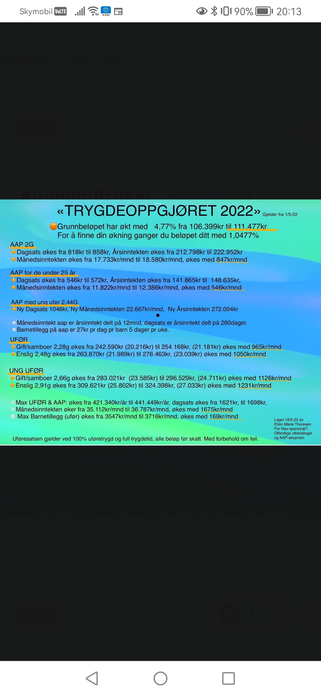 AnonymBruker Skrevet 25. mai 2022 #1 Skrevet 25. mai 2022 Hei. jeg ser at de skriver at de fleste som får ytelser fra nav går opp 4,77 prosent. Men de snakker også om at det er det 1G har gått opp. Blir litt forvirret, betyr det at jeg får en økning på 4,77 % på min uføretrygd eller hvordan er det dette er? Anonymkode: 76353...0d7