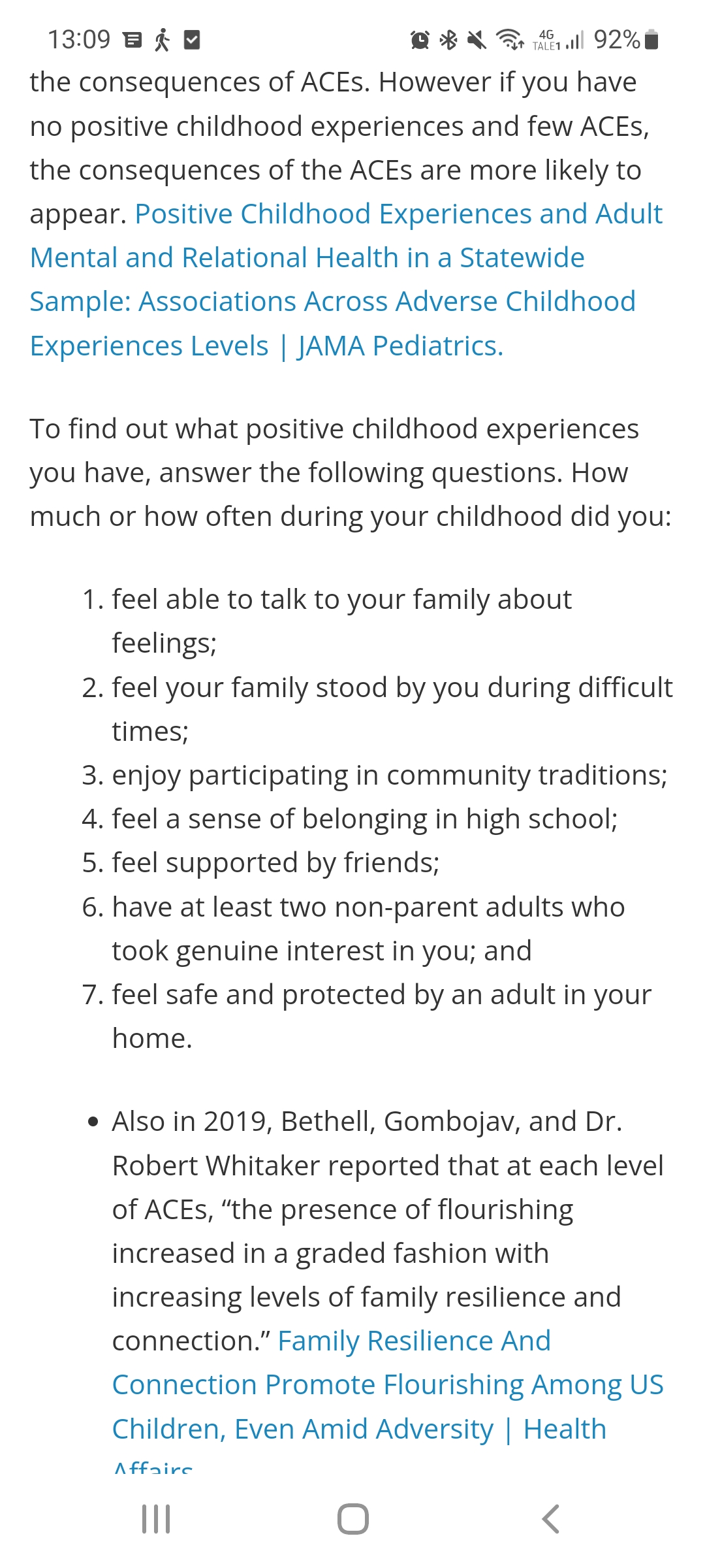 AnonymBruker Skrevet 4. juni 2022 #116 Skrevet 4. juni 2022 AnonymBruker skrev (2 timer siden): For de som måtte ønske å teste sin ACE score (Adversial childhood experience) og https://acestoohigh.com/got-your-ace-score/ Finnes også en tilsvarende test for beskyttelsesfaktorer. Anonymkode: 19426...aca Den var interessant. Fikk 7 (evt 8 om periodedrikking teller) av 10. Null på spørsmål om positive erfaringer fra barndommen. Kan du lenke til beskyttelsesfaktorene også? Anonymkode: aa002...f98