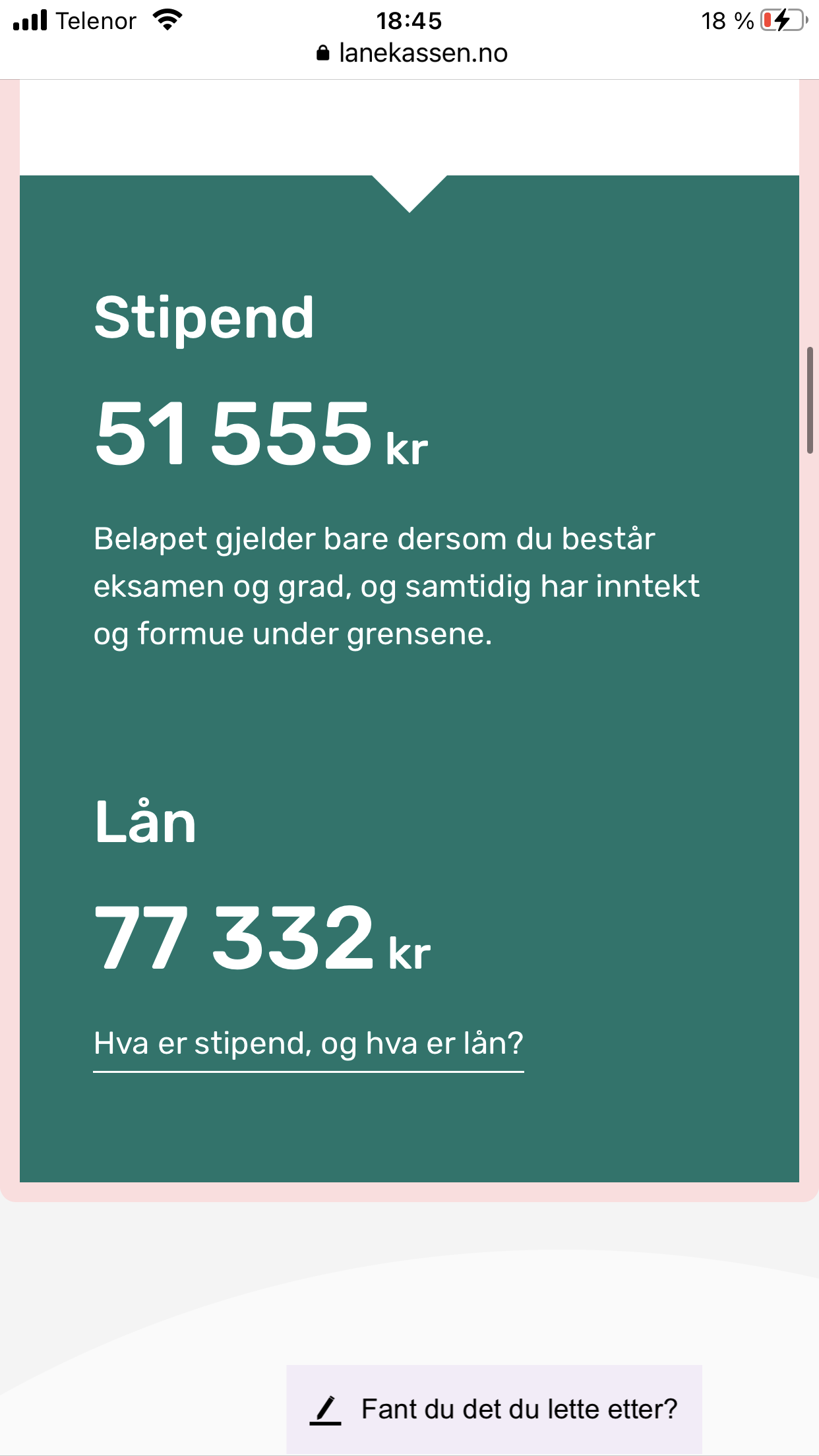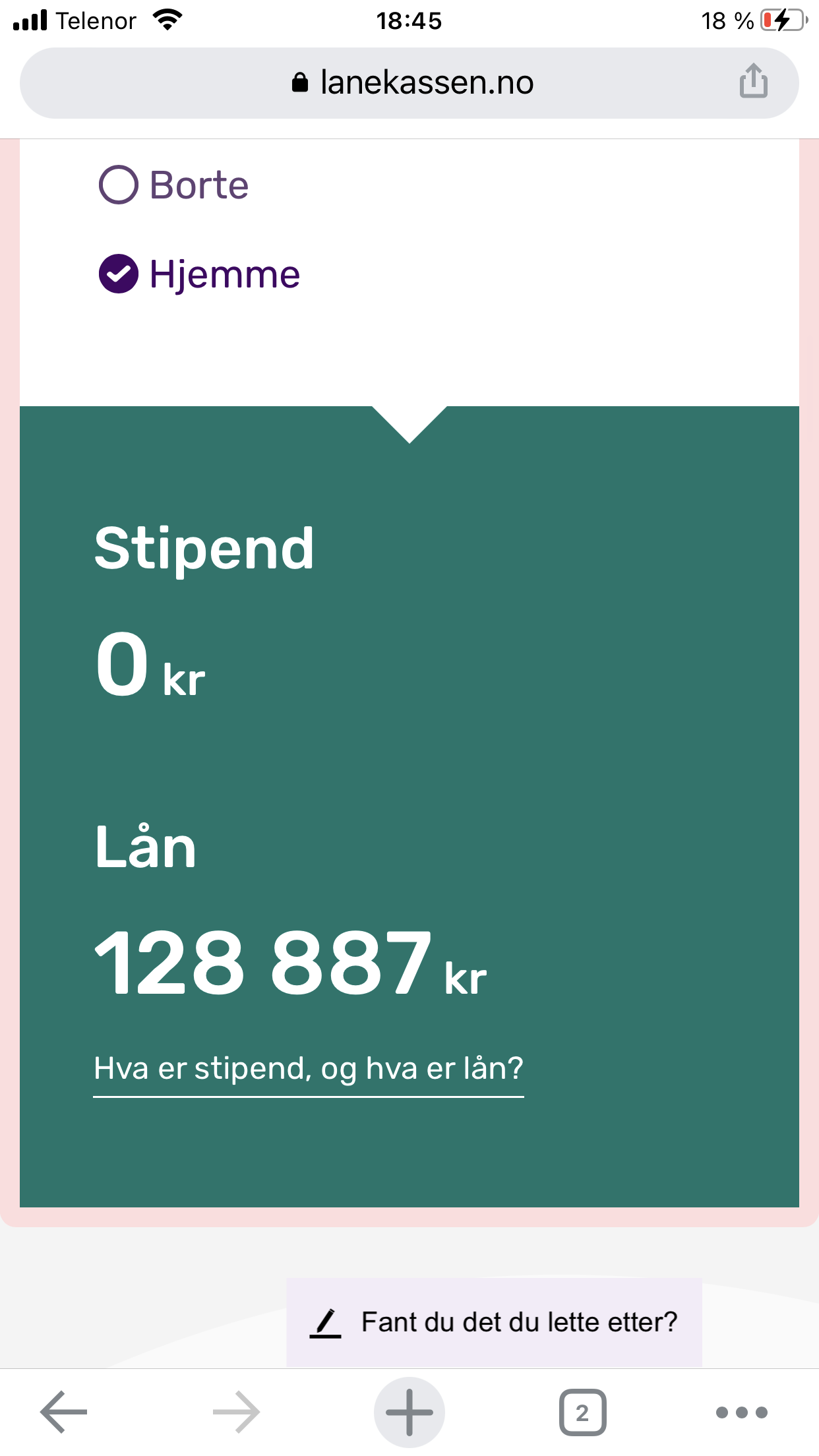 AnonymBruker Skrevet 4. juni 2022 #4 Skrevet 4. juni 2022 AnonymBruker skrev (1 time siden): Takk. Hva hvis man bor hjemme og studerer deltid? Anonymkode: 90201...dbc https://lanekassen.no/nb-NO/stipend-og-lan/norge/universitet-og-hogskole/ bruk kalkulatoren til lånekassen Anonymkode: 0f2ce...ef4