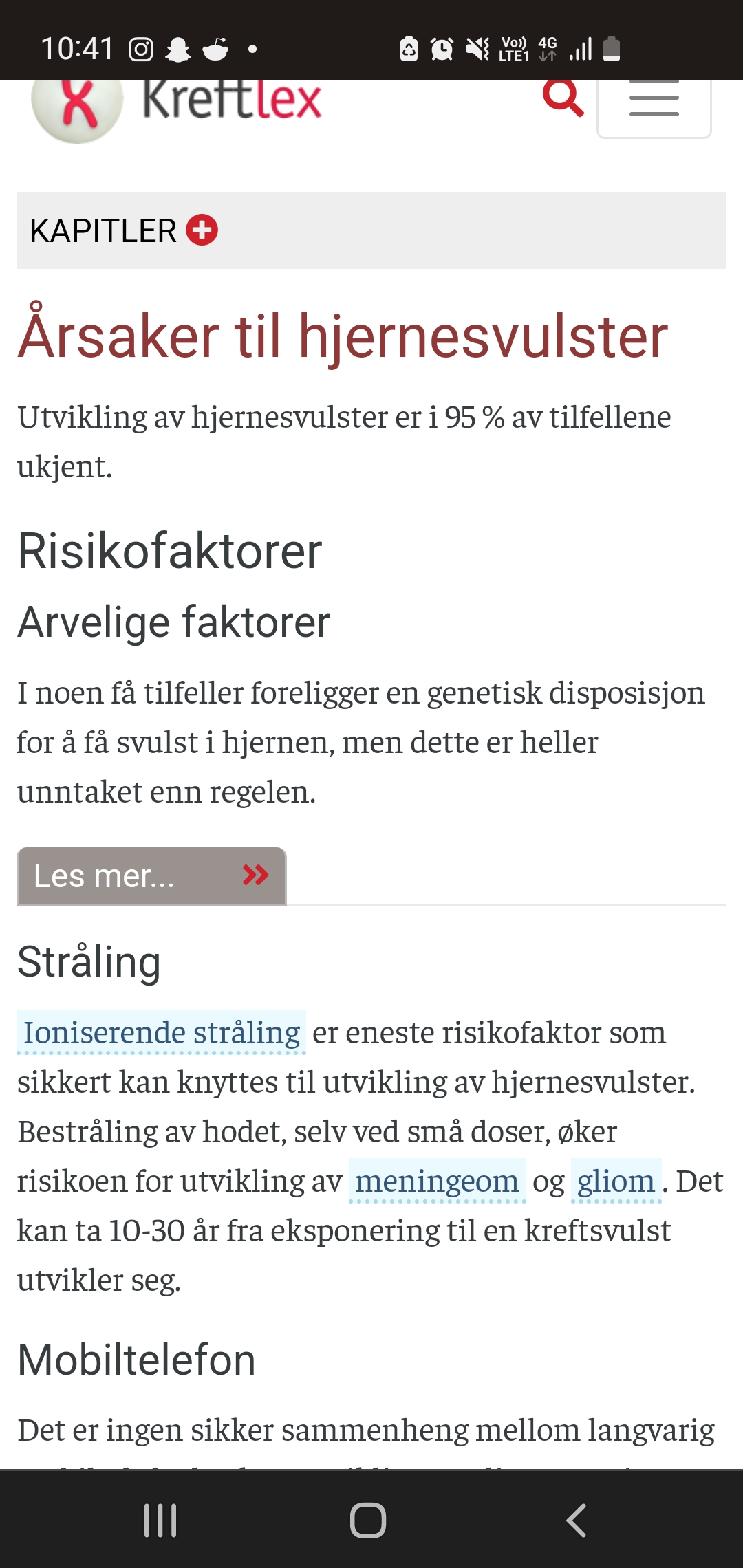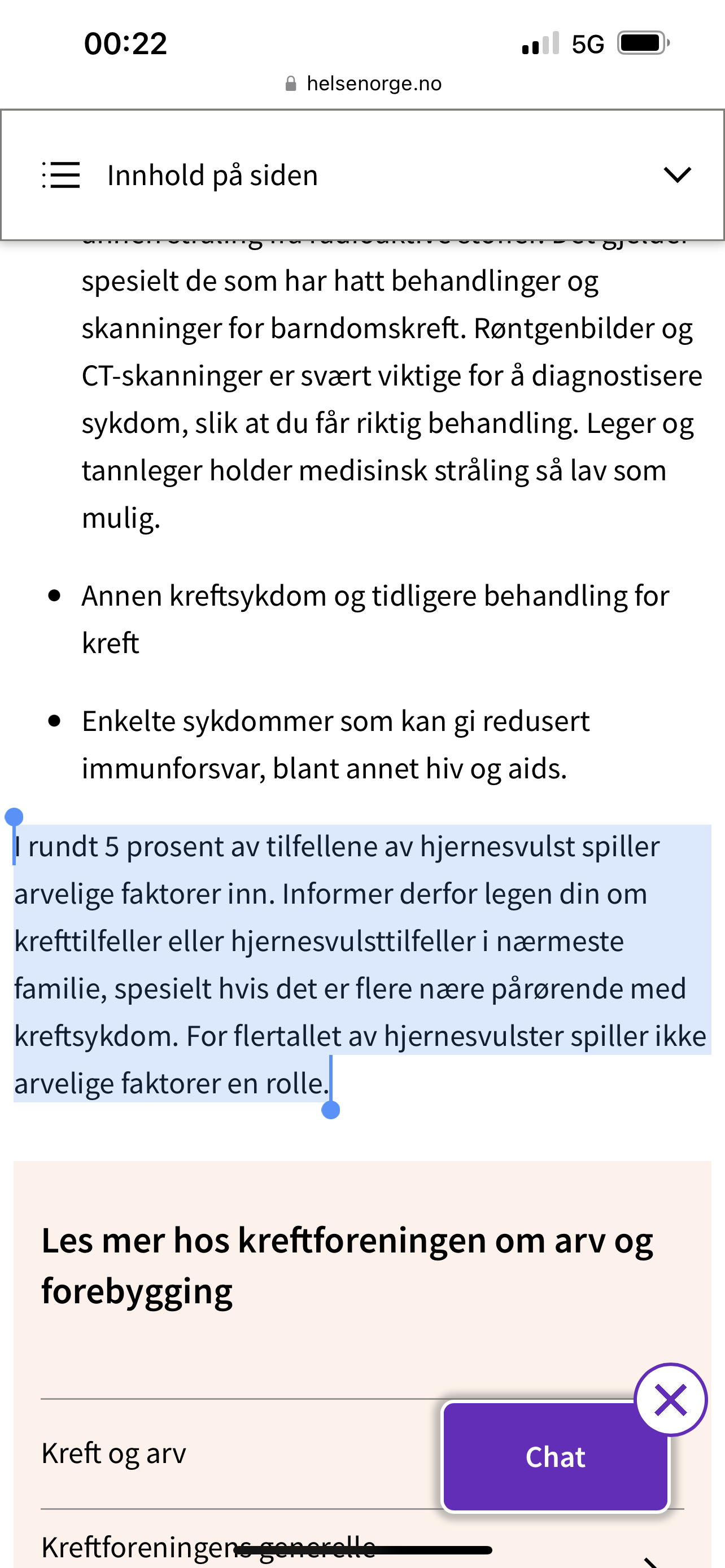 AnonymBruker Skrevet 9. juni 2022 #7 Skrevet 9. juni 2022 Frukthage skrev (På 7.6.2022 den 23.50): Ja, fordi det i 5% av tilfellene er genetisk betinget: «Utvikling av hjernesvulster er i 95 % av tilfellene ukjent». Jeg vil anta at fastlegen mener at det ikke er grunn til å henvise til genetisk testing, men det er verst for TS å snakke med fastlegen sin om det siden dette er noe hun tenker på. Det er jo ikke det som står? Legger inn screenshot. Det står at årsaken ofte er ukjent. Under det står det en egen overskrift med at arv heller er unntaket. Det er lang vei mellom det som blir sagt på lenken og din fremstilling av at 5% er genetisk! Anonymkode: c06e4...f58